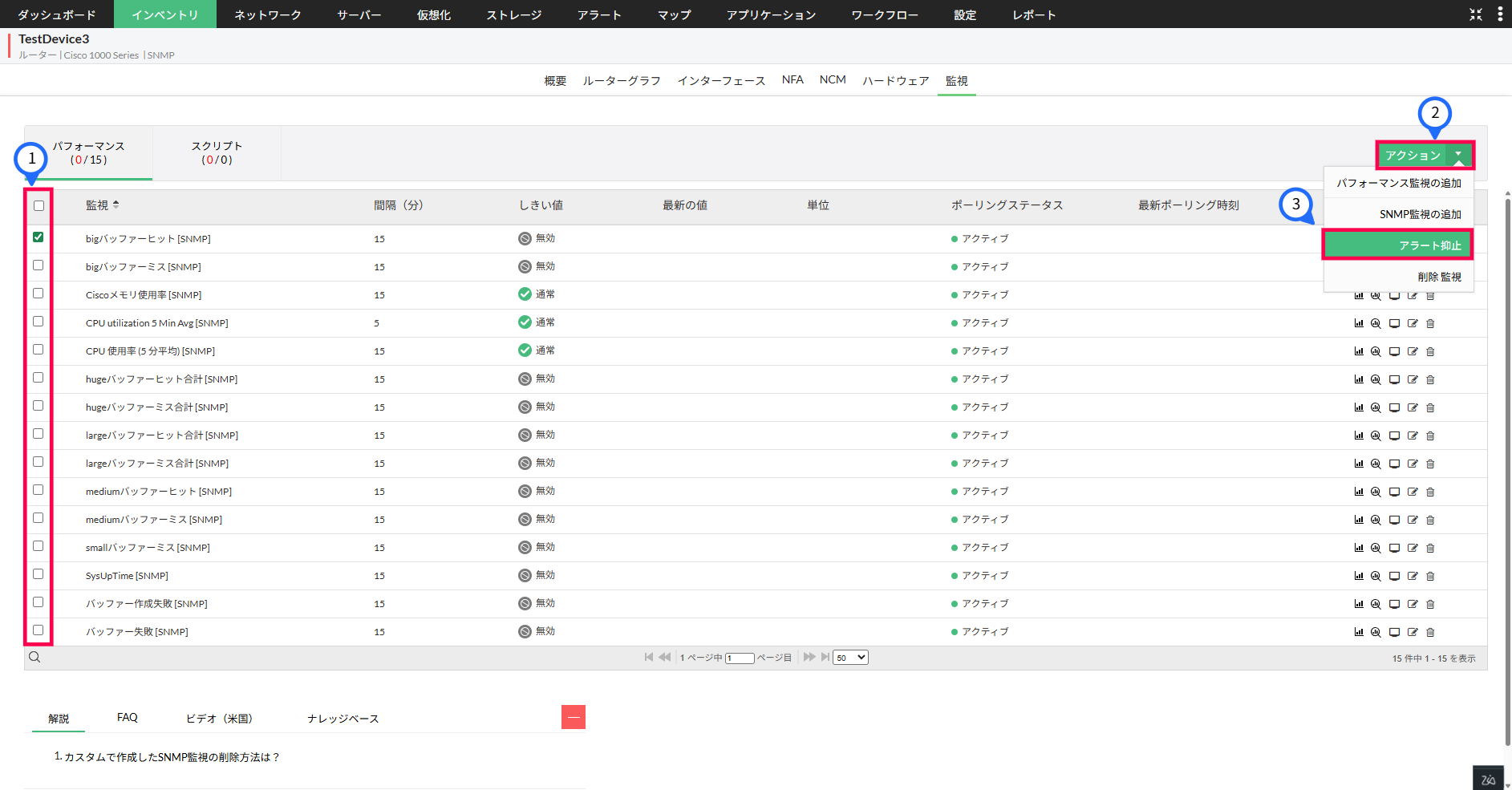 装置またはインターフェースに対するアラートの抑止設定は、以下の手順で実施できます。