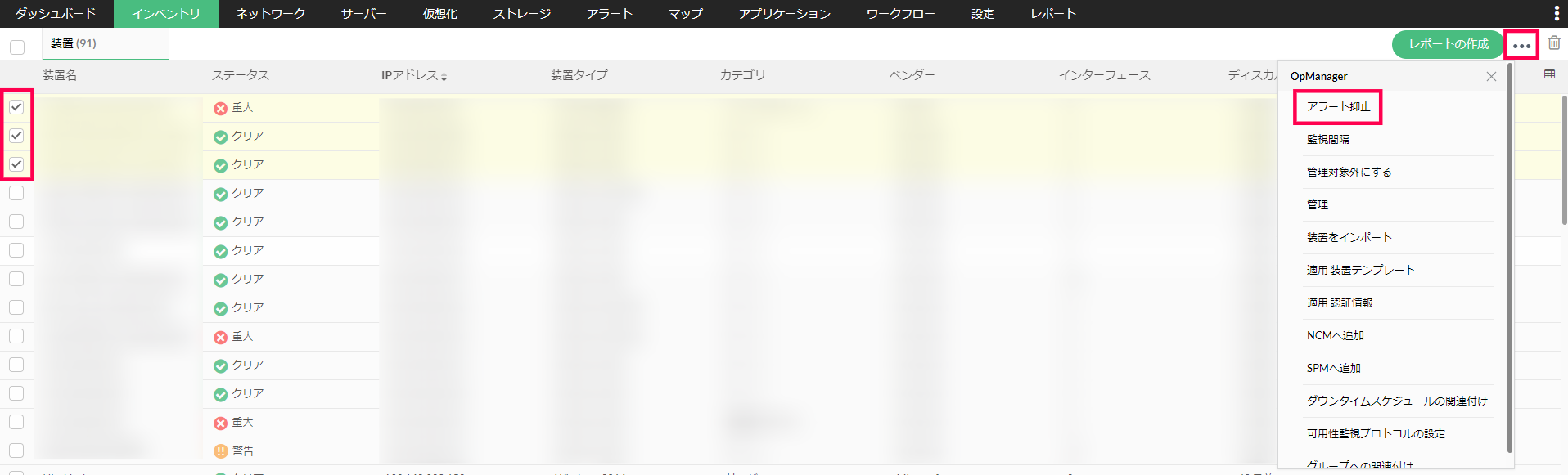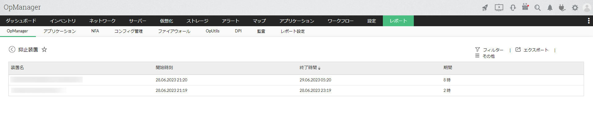 アラートが抑止されている装置の一覧は、[レポート]→[OpManager]→[システムレポート]の[抑止装置]レポートより確認できます。