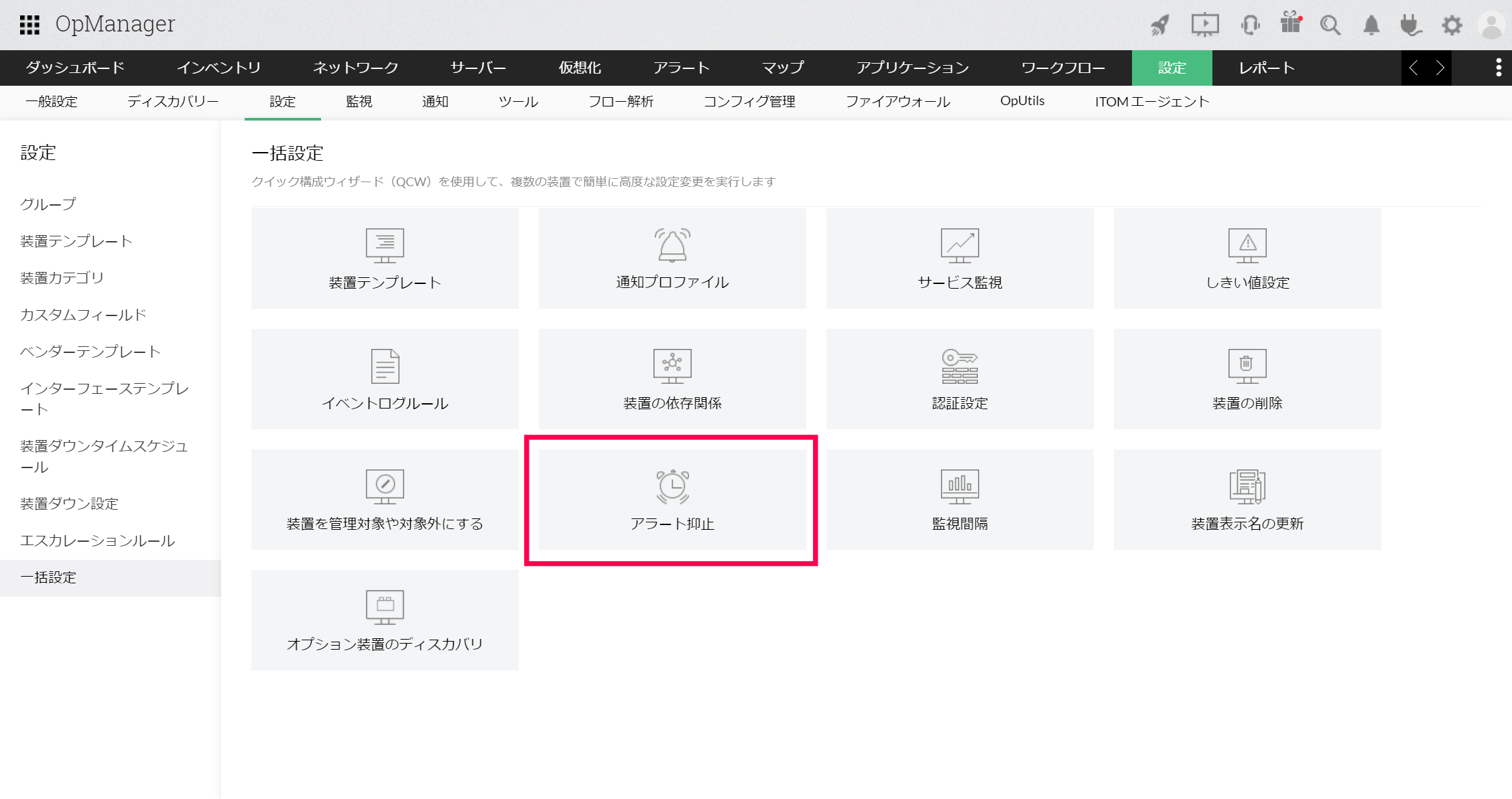 - [設定]→[設定]→[一括設定]から、[アラート抑止]をクリックします。