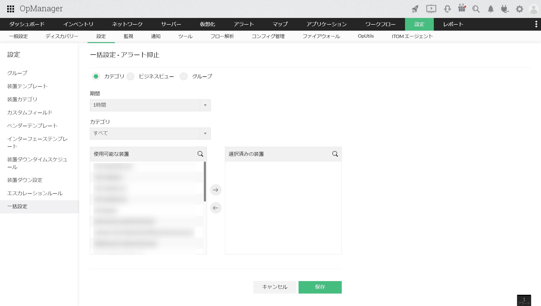 項目 説明 カテゴリ アラートを抑止する装置のカテゴリを、[カテゴリ]のプルダウンから選択します(すべての装置を表示する場合は、[すべて]を選択)。