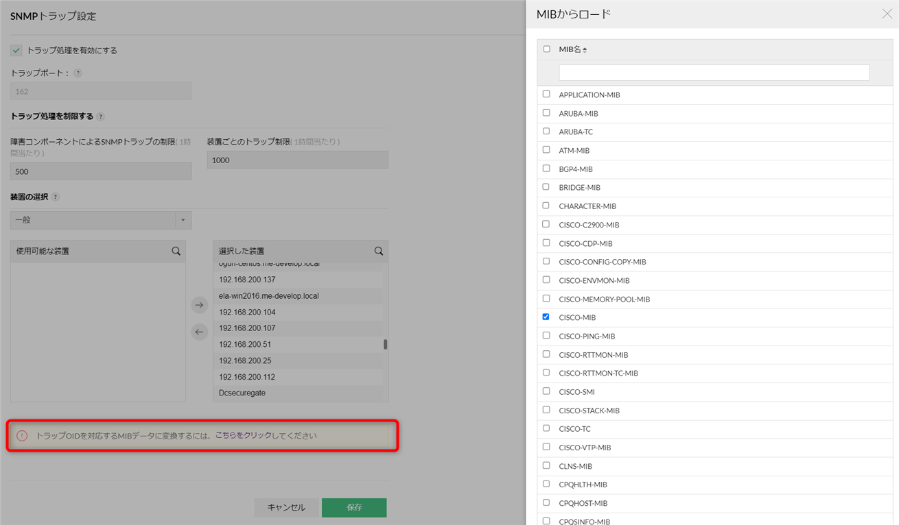 SNMPトラップ設定の画面下部の、[SNMPトラップOIDを対応するMIBデータに翻訳するには、こちらをクリックしてください]より、