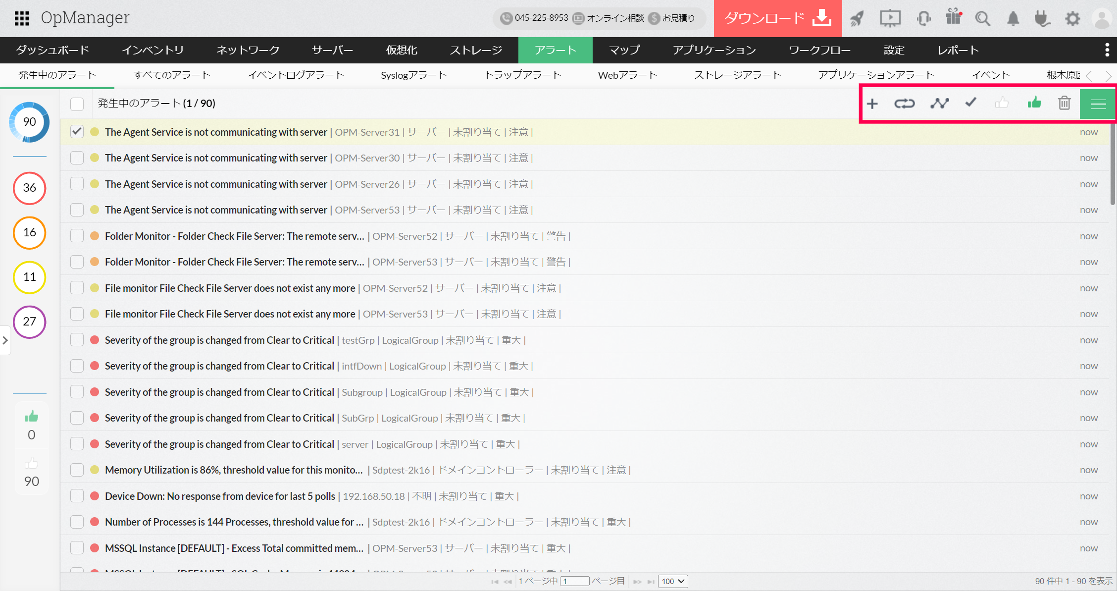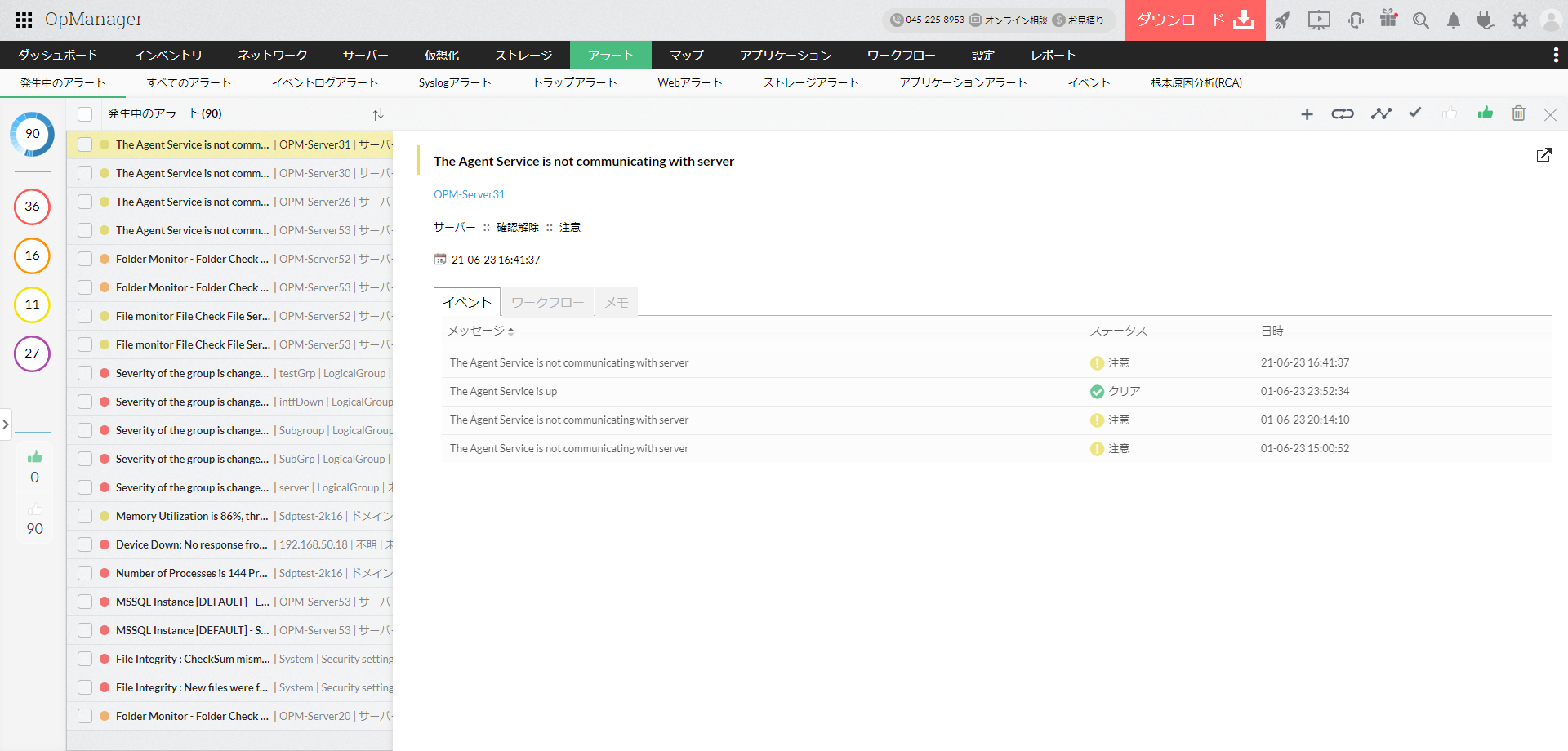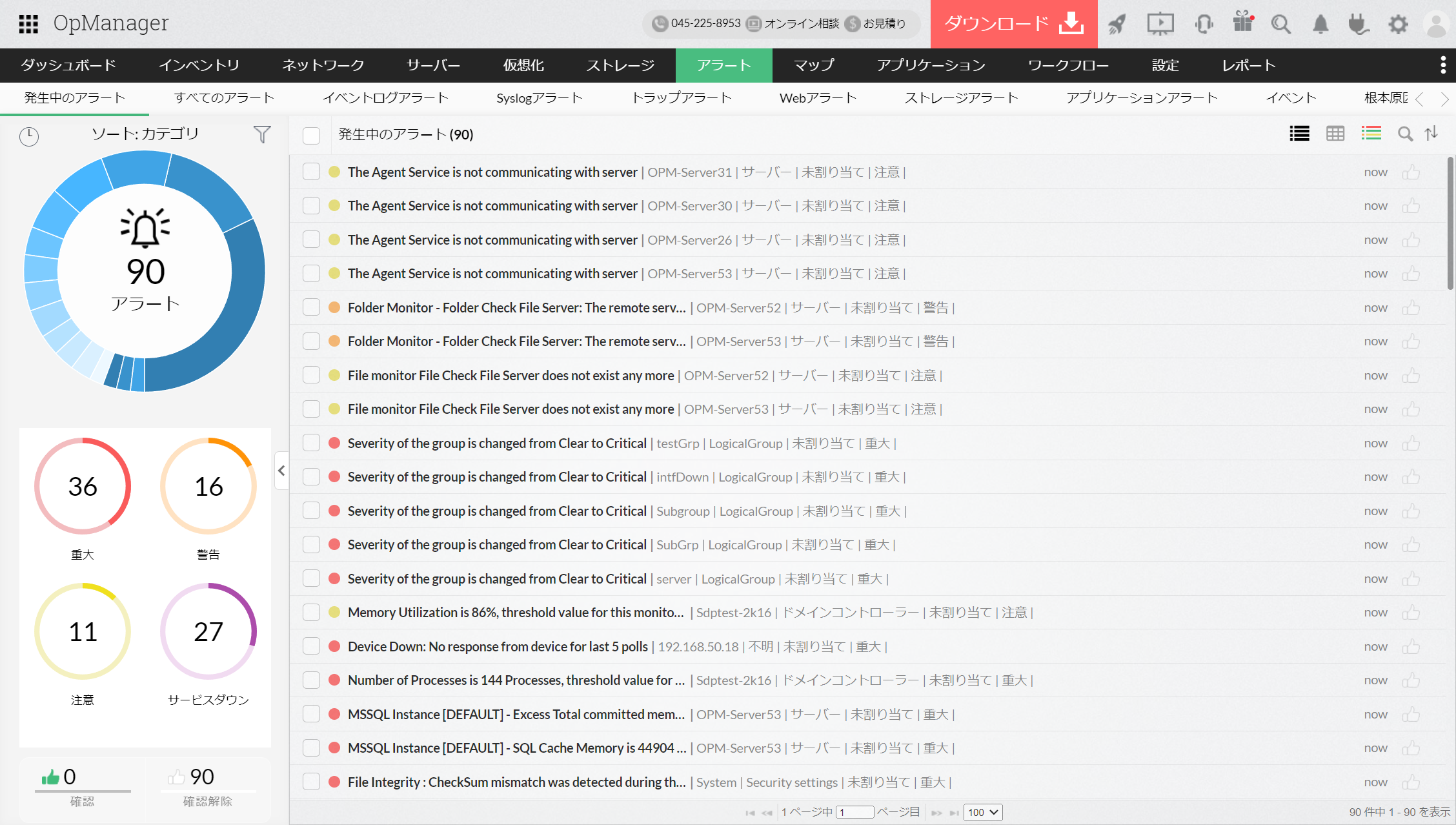 OpManagerで発生したアラートは、[アラート]から確認できます。
