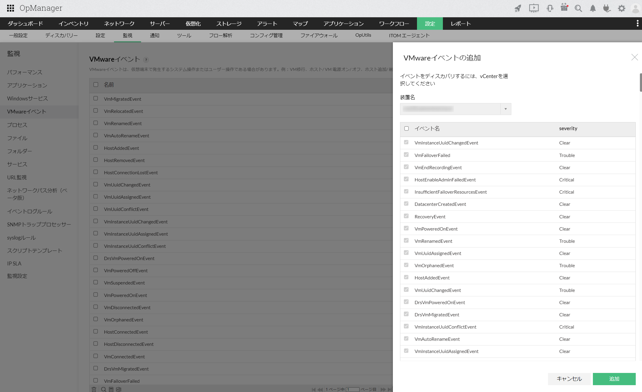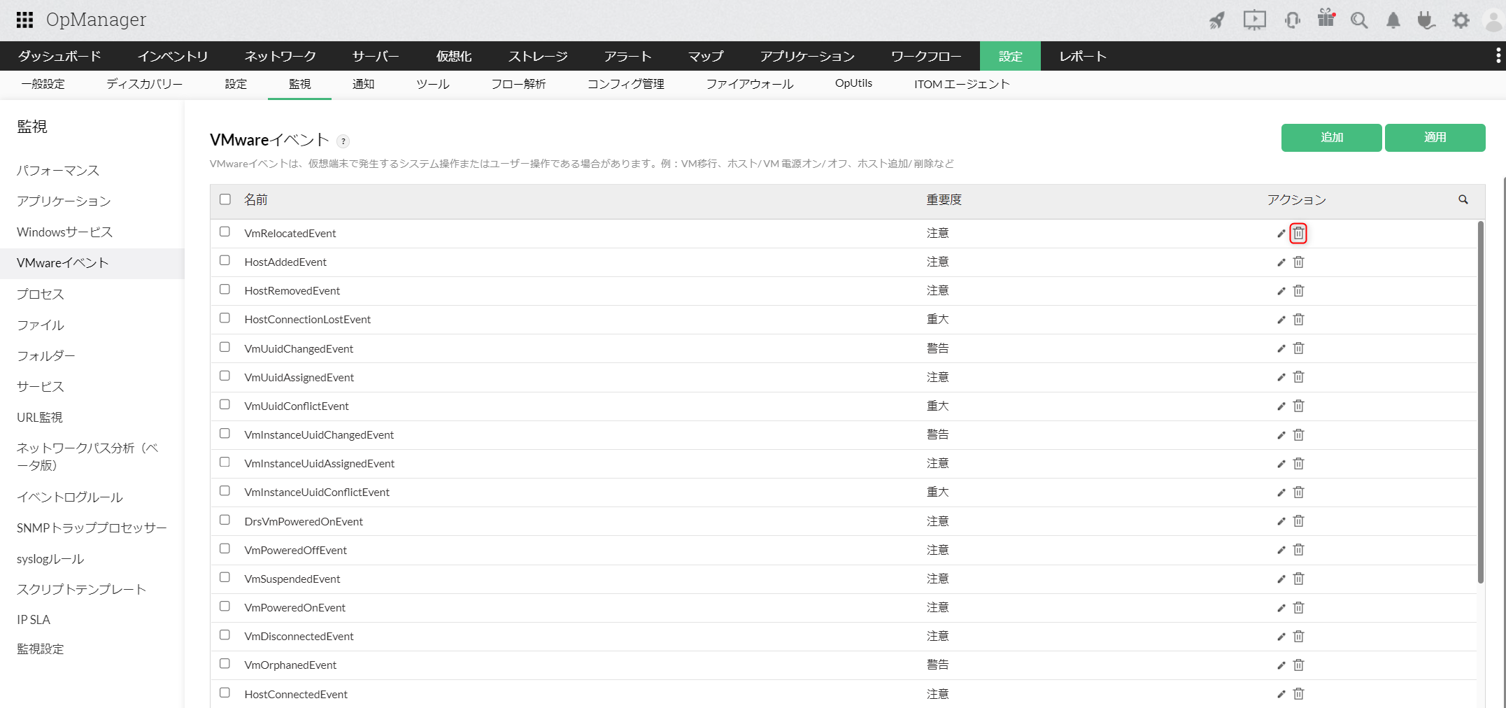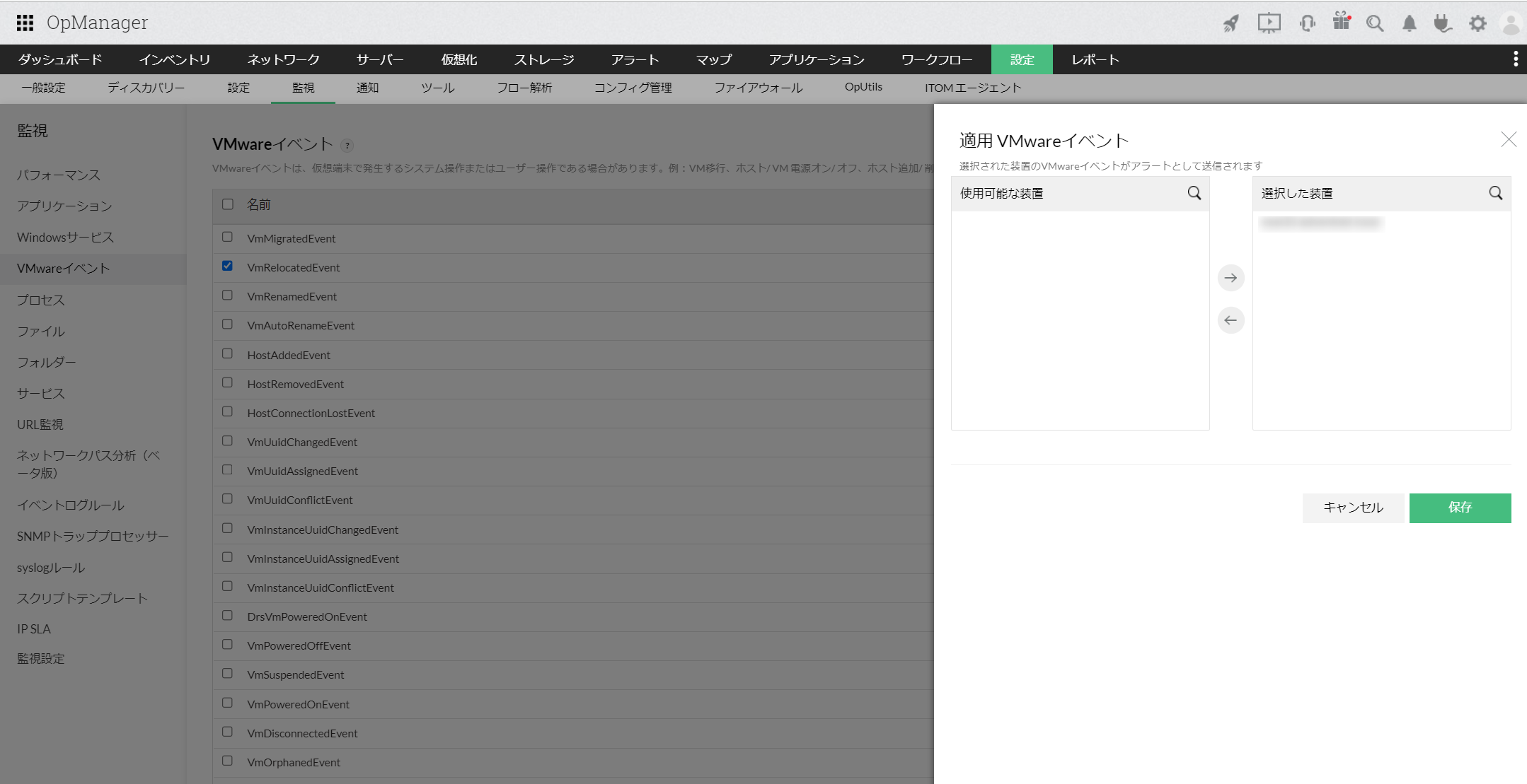 VMwareの代表的なイベントは、あらかじめOpManagerに監視対象として追加されており、[設定]→[監視]→[VMwareイベント]からその一覧を確認できます。