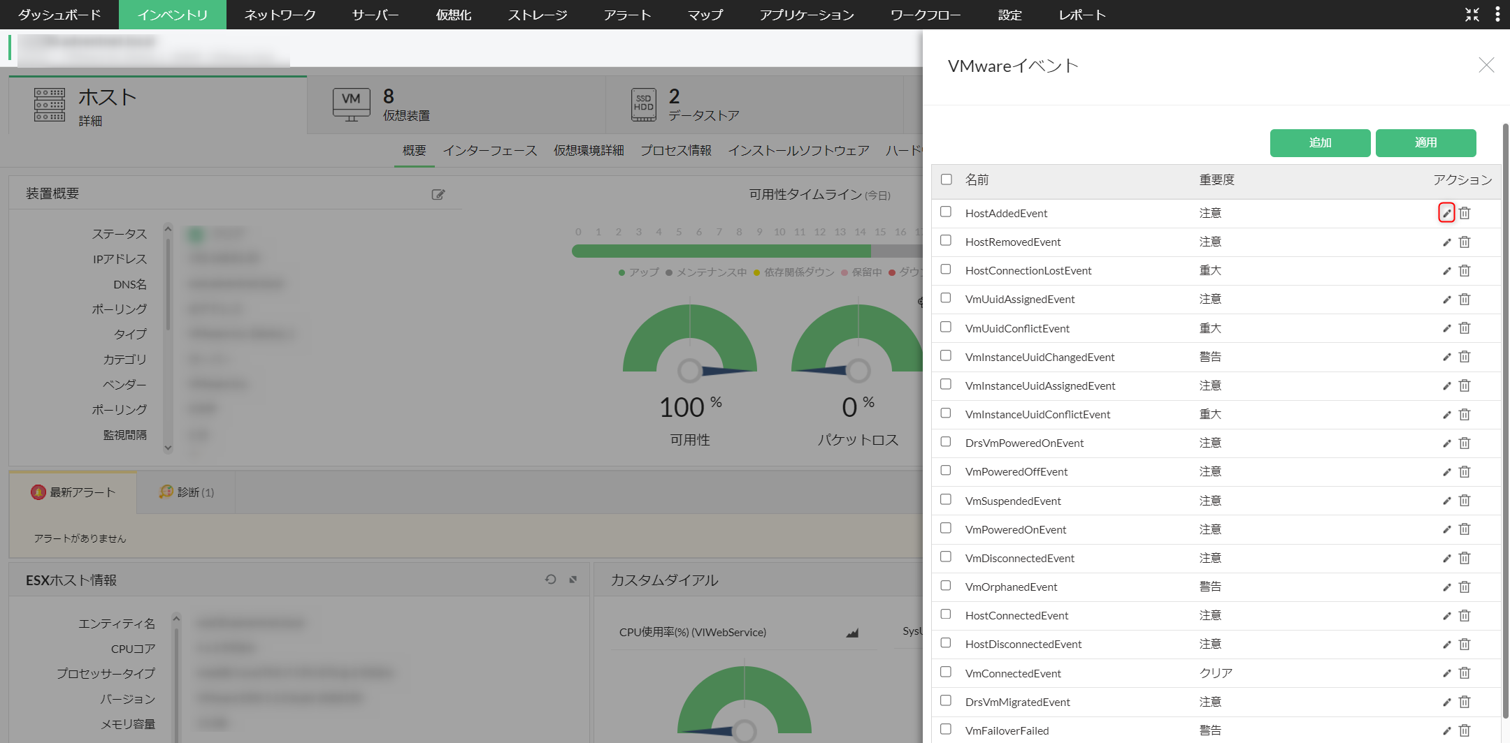 - [仮想化]からアラートの重要度を変更するvCenter/ESXサーバーをクリックし、装置の概要ページに移動します。