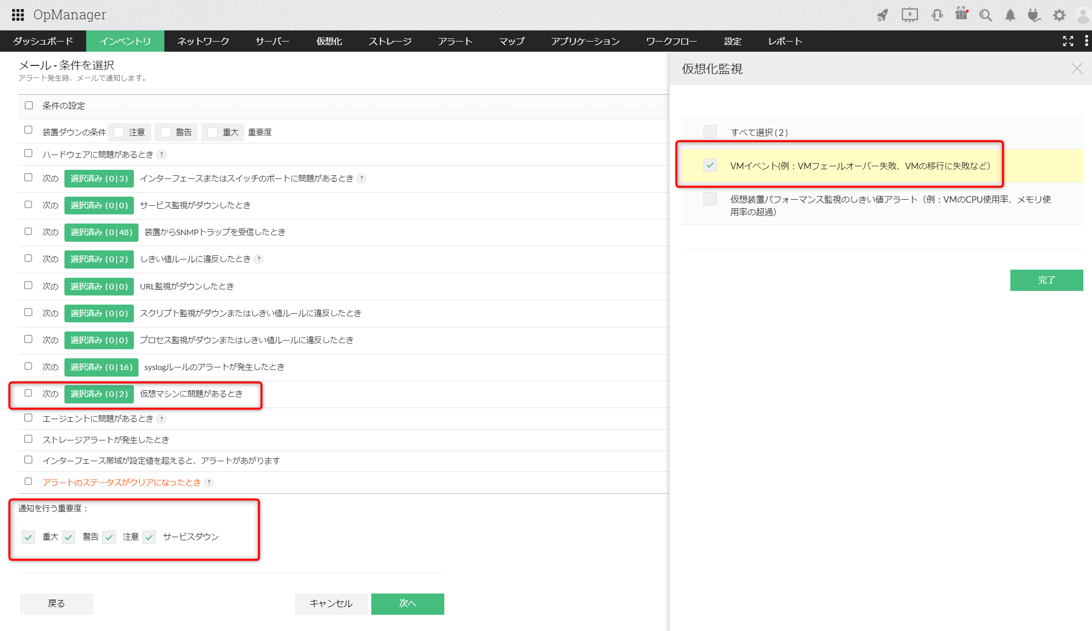 ディスカバリーしたvCenter/ESXサーバー上で発生したイベントに基づいて、OpManager上でアラートを発報することができます。