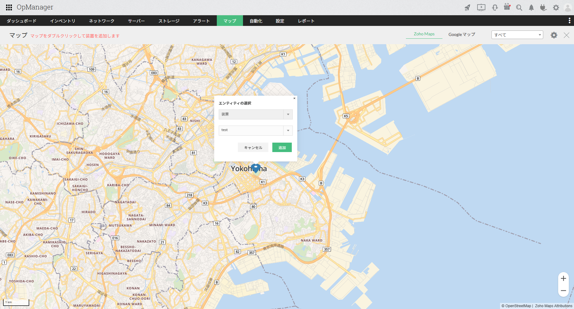 Zoho Map上に追加した装置に対して、以下の操作が実施できます。