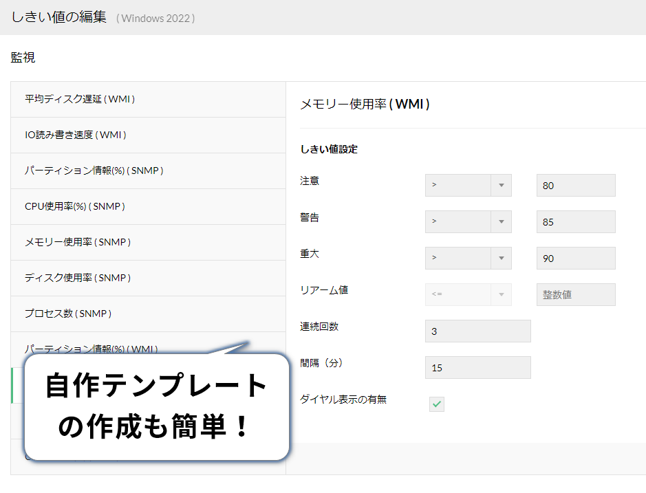 装置テンプレートは、各装置に合わせた監視項目と監視間隔があらかじめ定義されているセットです。OpManagerには10,000を超える装置のテンプレートが標準装備されています。この標準装備の装置テンプレートをニーズに合わせて編集するのはもちろんのこと、新たに自分でテンプレートを作成することも可能です。
