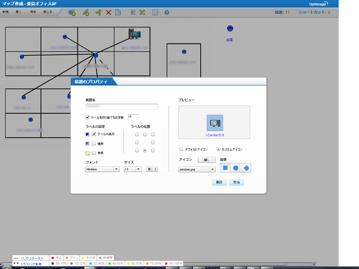 OpManagerのビジネスビューはカスタマイズ性に大変優れています。マップ上に自由に装置を配置し、見分けやすいようにサーバーの通称をラベルに書いたり、そのラベルの色を変更したりと、各人が使いやすいようにカスタマイズすることができます。