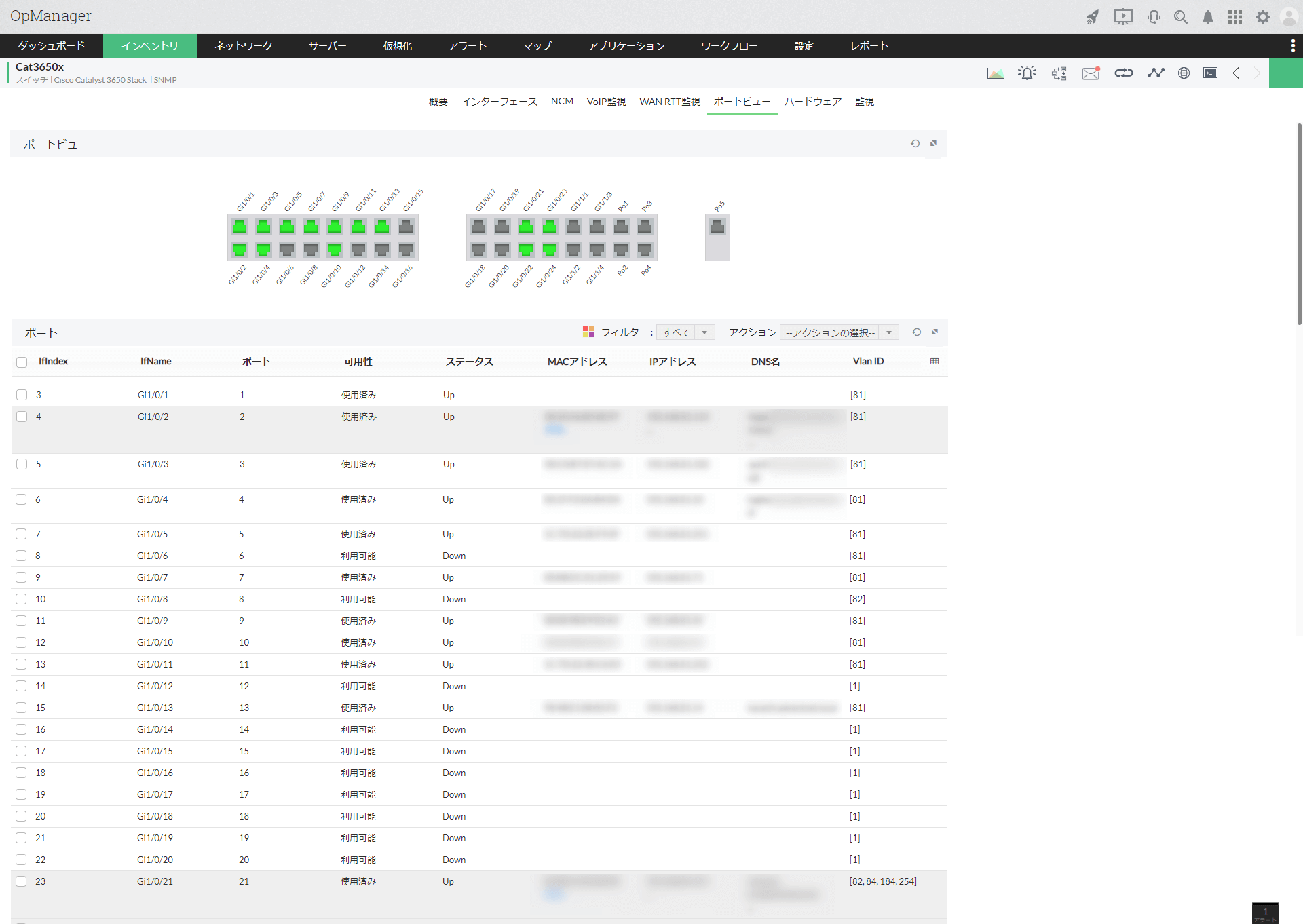 スイッチポートマッパーはOpManagerに組み込まれた便利なネットワークツールです。スイッチポートに接続している装置のMACアドレスやその他の重要なパラメーターを素早く表示します。