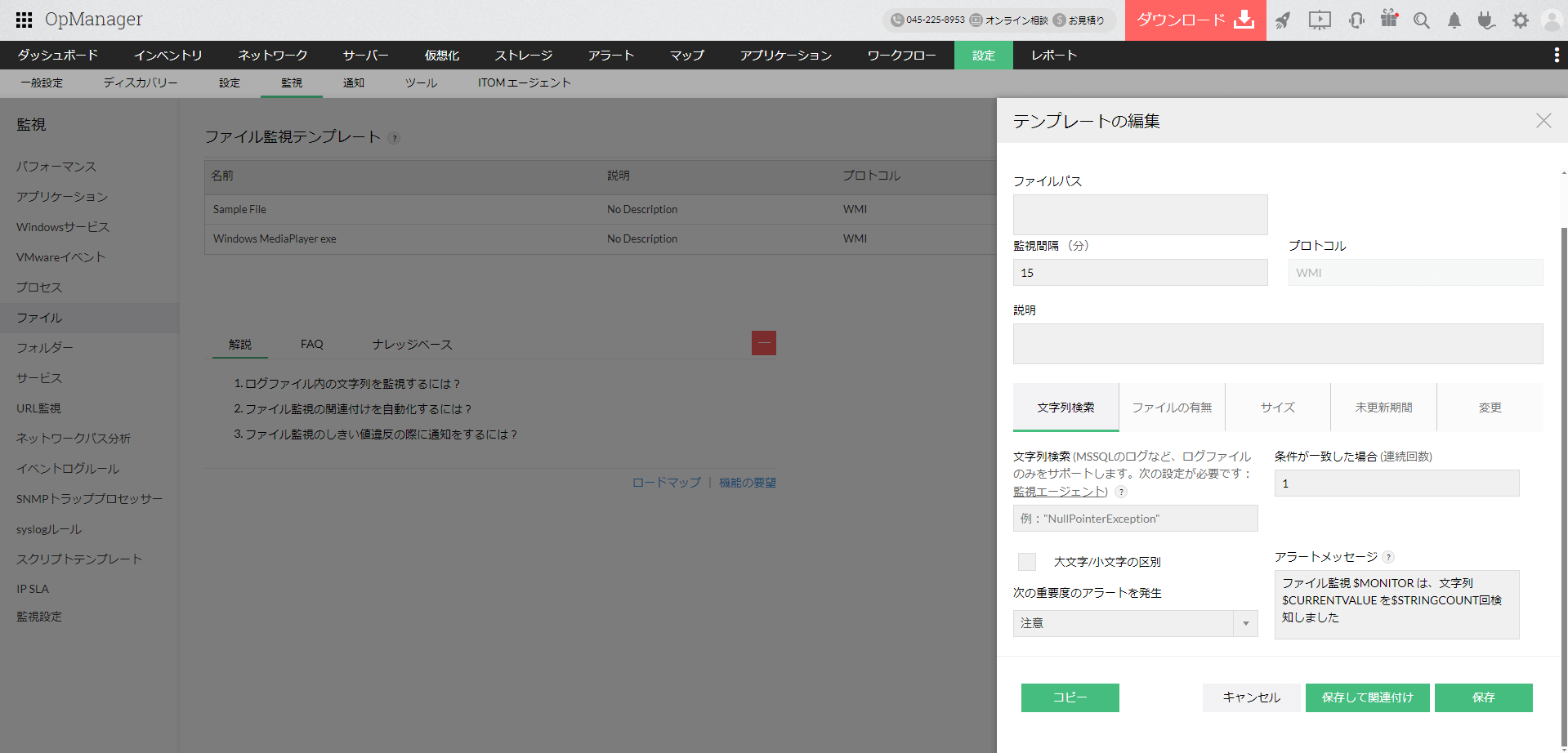 OpManagerのサーバー監視は、サーバー内のフォルダーやファイルを監視する機能を備えています。ファイルやフォルダーの削除、更新を監視し、サイズ等が設定した値を超えた場合に、管理者に通知します。
