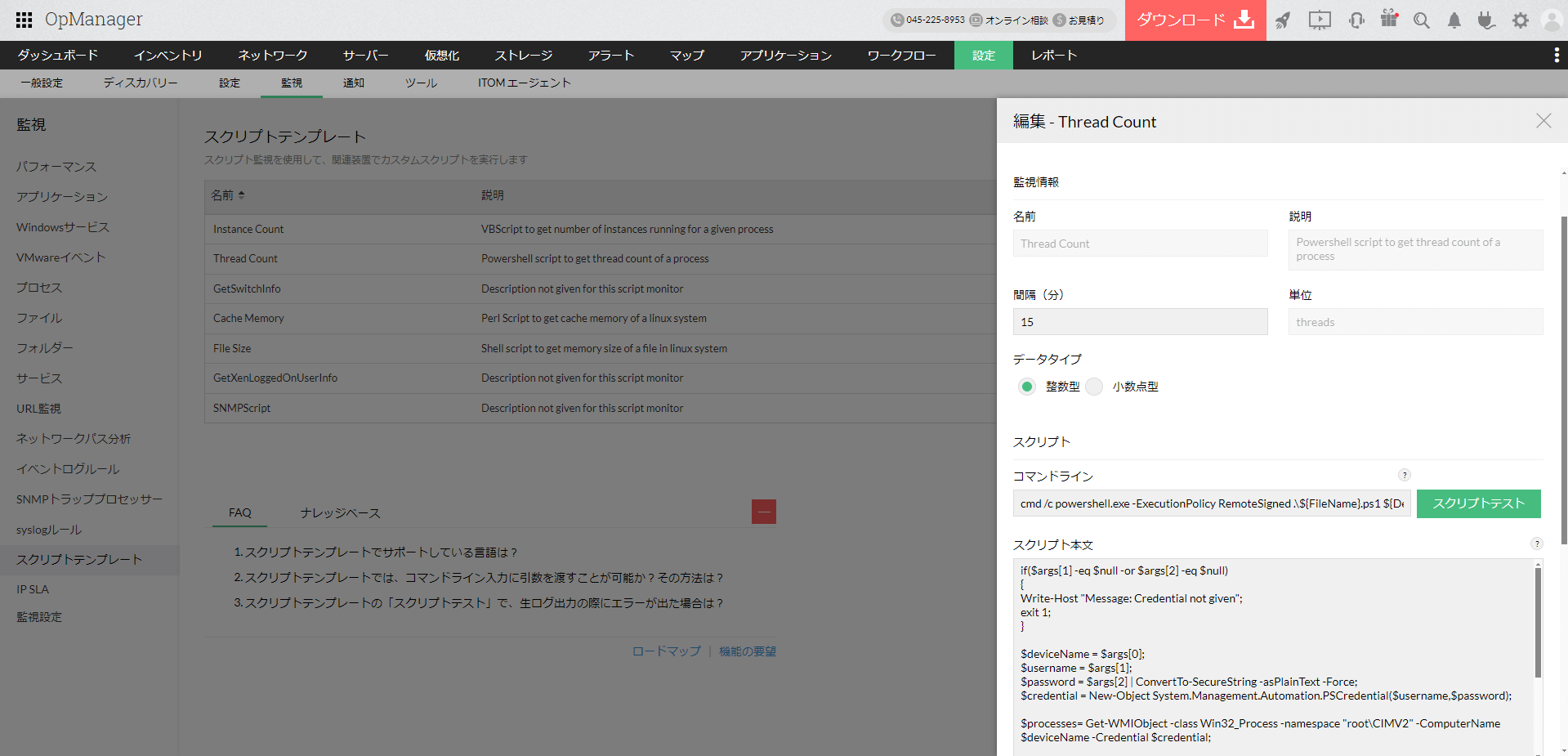 OpManagerに標準で装備されている監視項目に加えて、様々なサーバーのデータを収集することができます。Windows PowerShell、Linux シェルスクリプト、VBScript、Python、Perlといったスクリプトに対応しています。