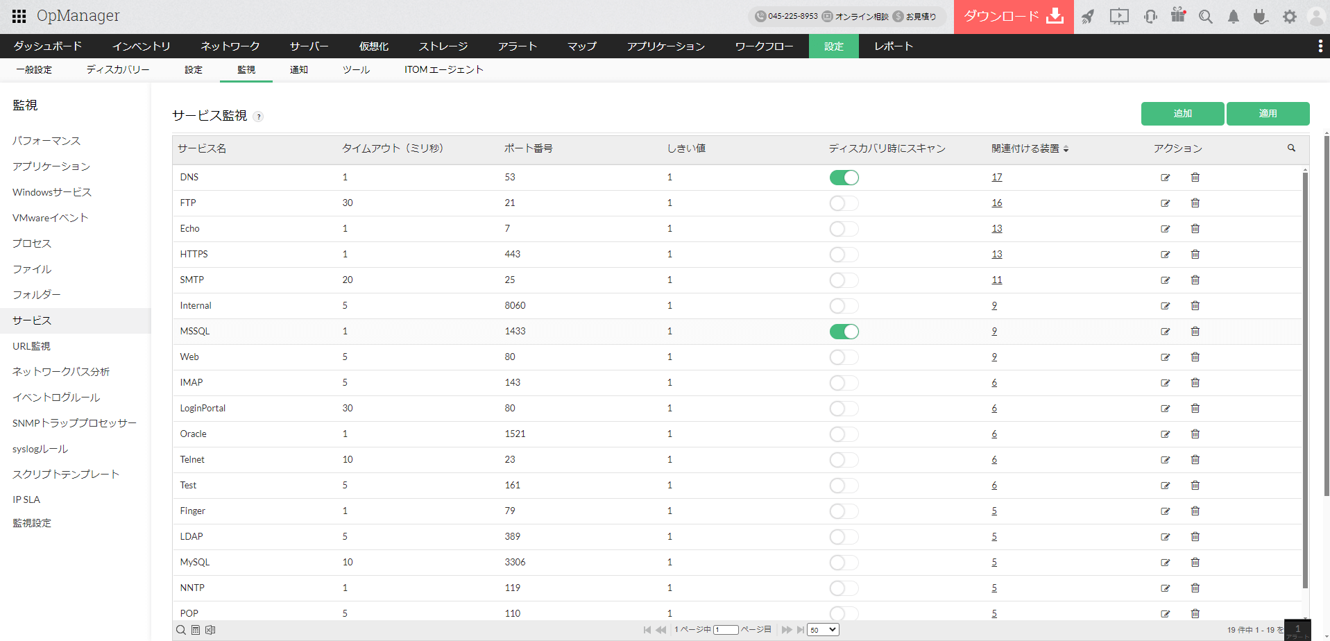 - HTTP、HTTPS、FTP、SMTP、POP、IMAP、LDAP、DNS などの標準サービスの他に、独自のTCP サービスを監視可能