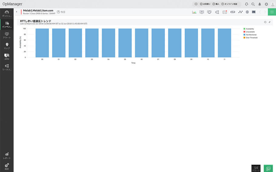100種類を超すすぐに利用できるサーバの性能レポートで可用性、リソース使用率、障害イベント等について把握でき、OpManagerが次回容量追加のためのすぐに役立つ情報を出力します。また、データセンターにある全サーバーの可用性と応答時間についてのその日のまとめカスタムレポートを作成でき、 これらを自動的に自分のメールボックスへ毎日送信させることができます。