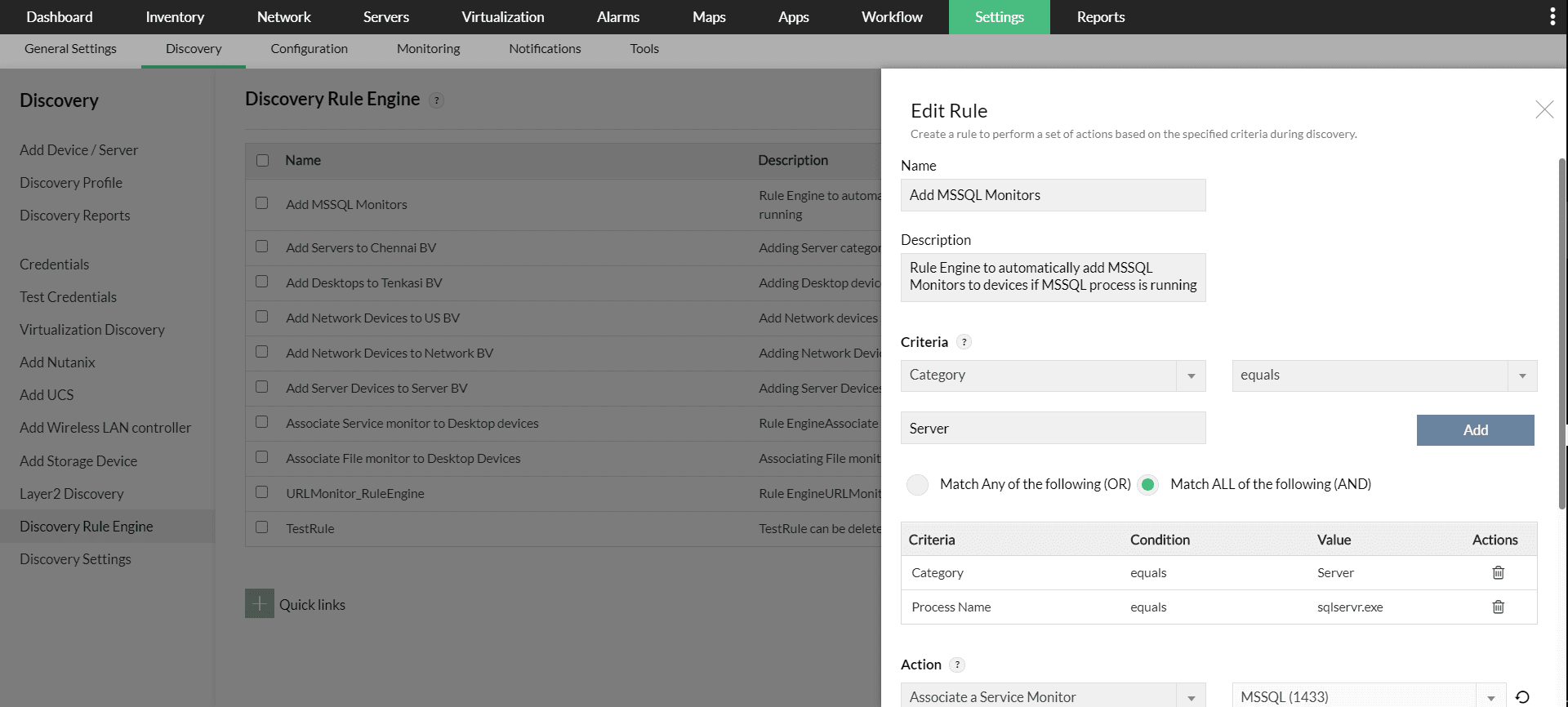 上記のすべてアクションは、OpManagerのディスカバリールールエンジンで実行されます。ディスカバリールールエンジンを使用すれば、ネットワーク管理プロセスを簡素化できます。特に大規模ネットワークでは非常に便利な機能です。
