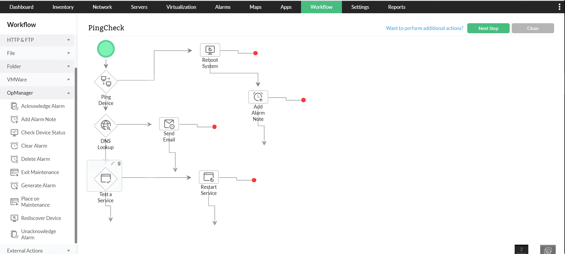・ワークフロー:OpManagerのワークフロー機能を使用することで、トラブルシューティングの一次対応や、定型的なメンテナンス作業の自動化などを実現可能です。インテリジェントな自動化機能であるワークフローでは、条件を定義し、装置やコマンドを選択することで作業を自動化できます。80種類以上のワークフローアクションが用意されており、ドラッグ&ドロップでアクションを組み合わせることで素早く柔軟にワークフローを構成できます。