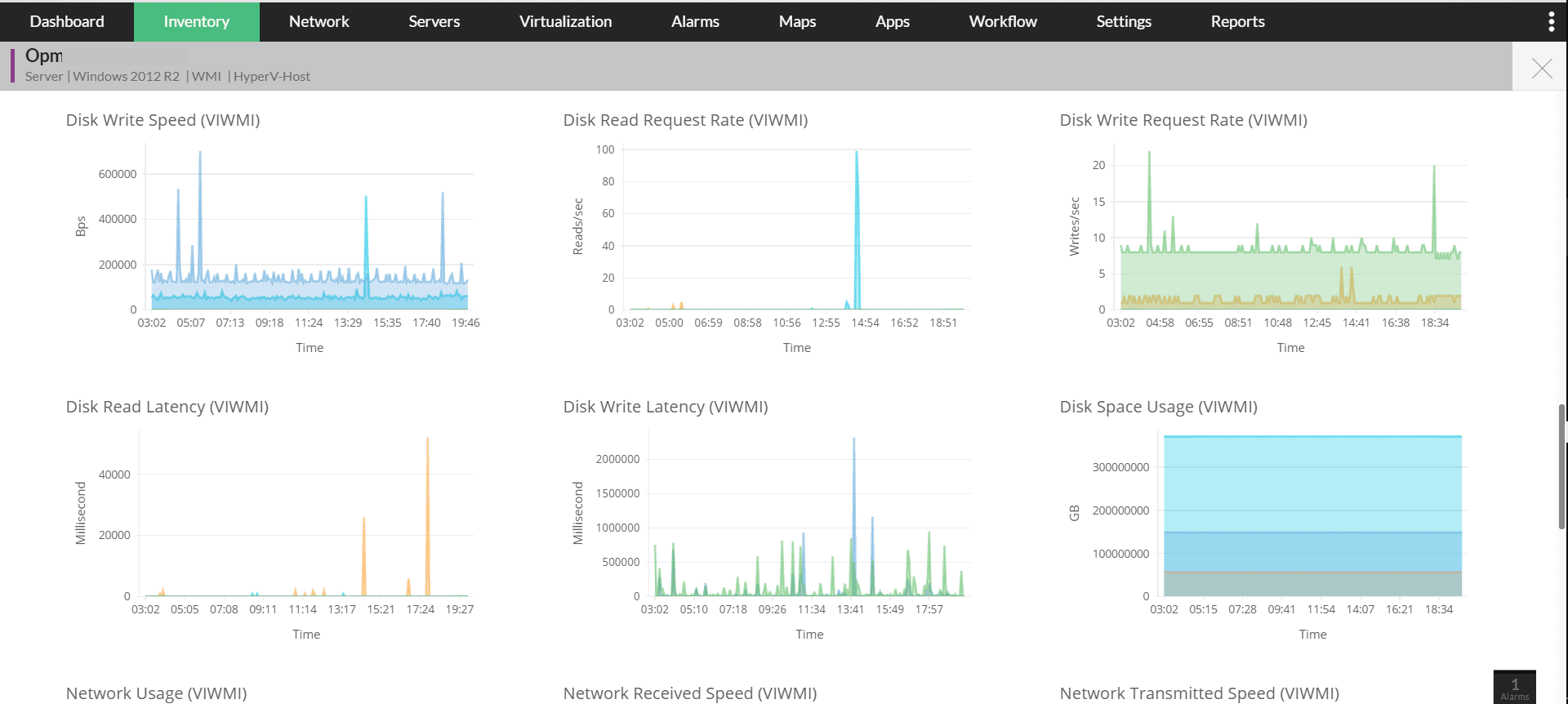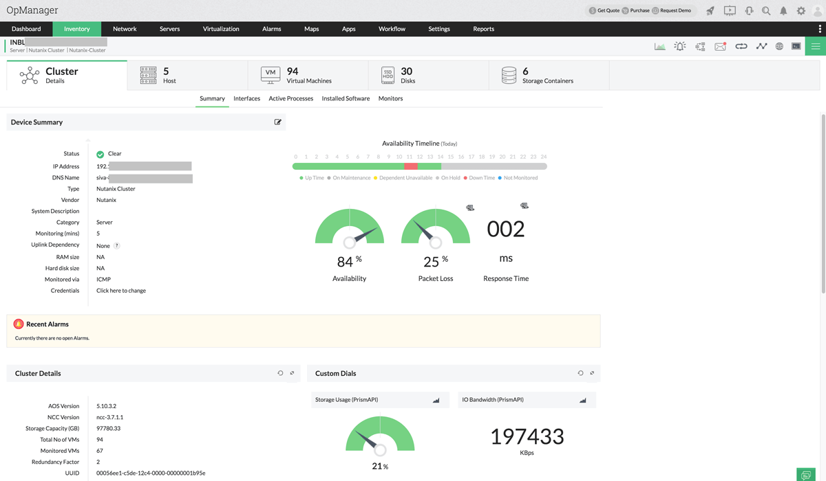 ・監視:大規模ネットワークでは、環境の拡大、接続するエンドポイントの増加、中継地点の機器の増加といった要因により、通信パフォーマンスの低下が発生しやすくなります。OpManagerは、スイッチ、ルーター、物理サーバーおよび仮想サーバー、インターフェース、Cisco UCS、Nutanix、ストレージ装置などの可用性、正常性、パフォーマンス(5,000を超えるパフォーマンス指標)をリアルタイムで監視します。装置のパフォーマンスを経時的に監視することで、問題の原因を早期に特定しやすくなります。これにより、ハードウェアの交換や新しい装置の購入といった、IT関連の意思決定を計画的に行えるようになります。