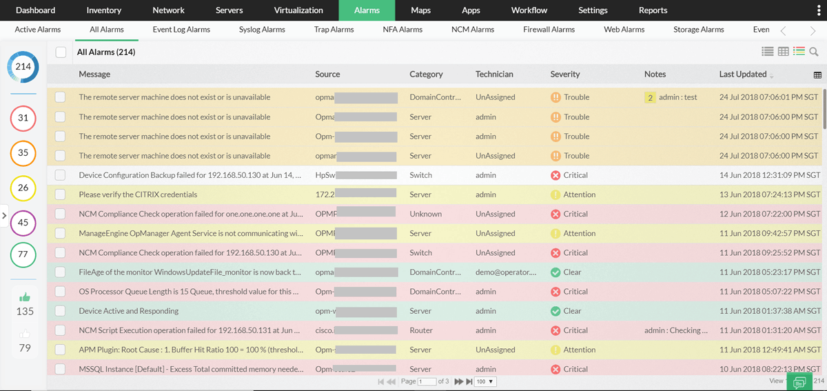 7. 多段階しきい値:OpManagerではアラート発報の基準となるしきい値を3段階(注意・警告・重大)に分けて設定できます。発報されたアラートは色分けされ管理画面上で可視化されるため、重大なネットワーク障害を特定して迅速に対応できます。