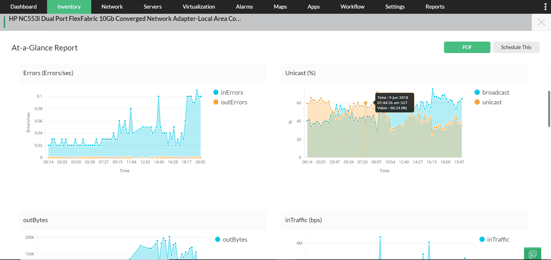 ・レポート:レポートは装置の異常やパフォーマンスの低下を特定し、文書化する上で役立ちます。OpManagerを使用してネットワーク装置に関するレポートを生成できます。このようなレポートでは、装置のパフォーマンスに関する詳細データを確認できます。OpManagerには200を超える設定済みレポートが用意されています。レポートはエクスポート、スケジュール設定、要件に合わせて簡単にカスタマイズすることが可能です。