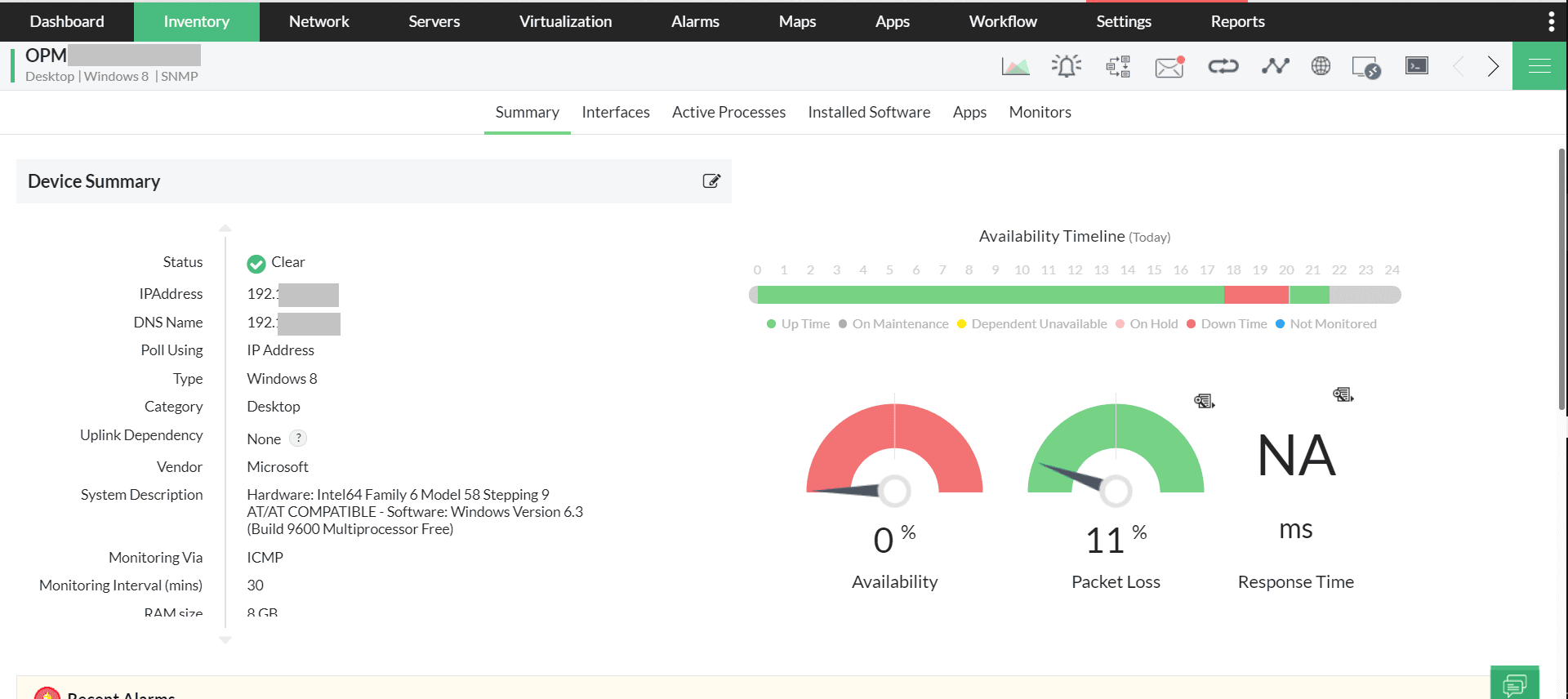 ・ディスカバリー:OpManagerを使用すると、指定の期間内にネットワークに追加された新しい装置を自動的に検知できます。OpManagerは、このような装置を検知すると、装置に関するデータを収集し、インベントリに追加します。インベントリの装置を「ディスカバリー時刻」順に並べ替え、大規模ネットワークを監視することもできます。
