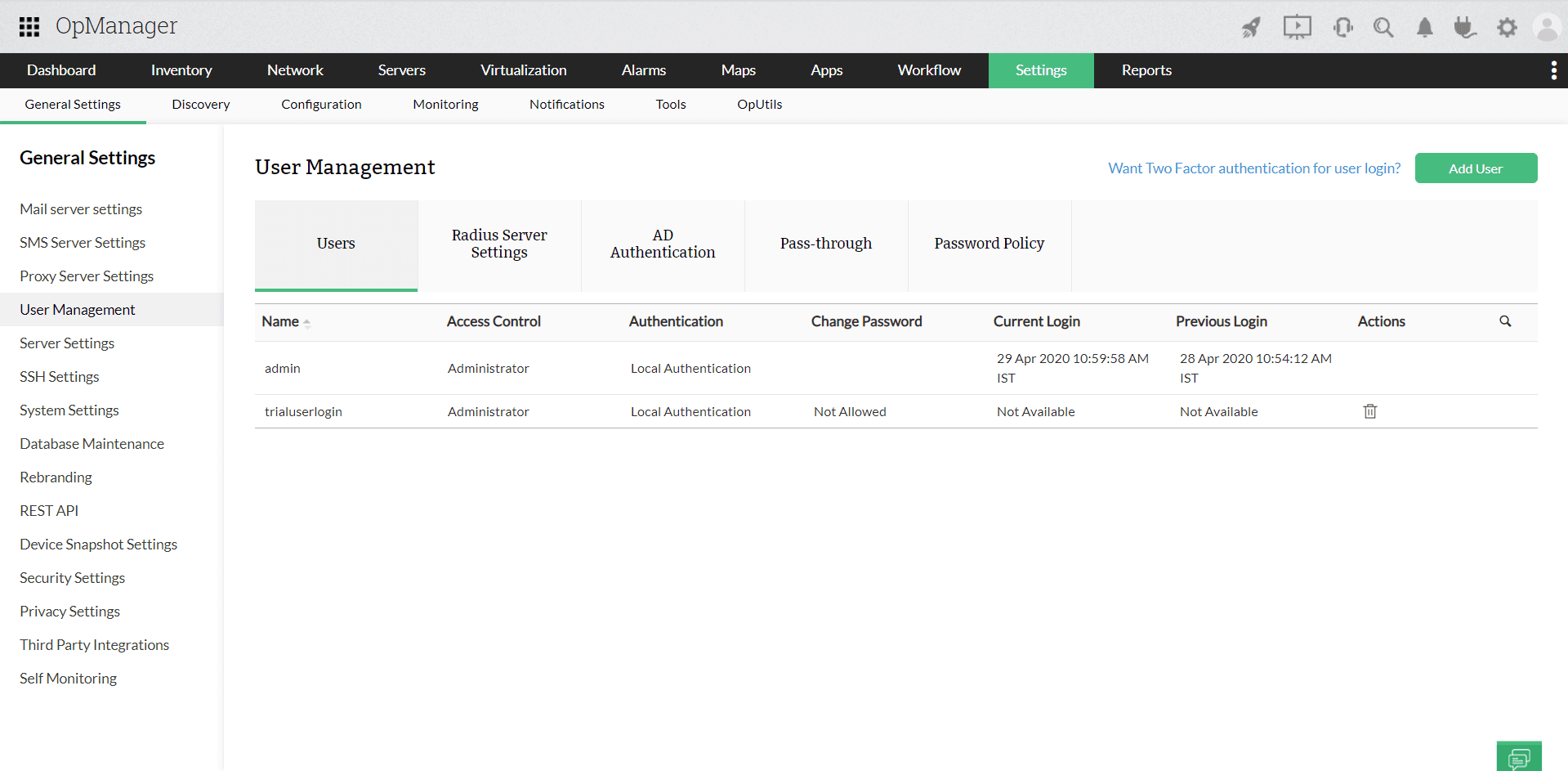 ・ユーザー管理:指定したユーザーにアクセス権を付与することで、ネットワークのセキュリティを確保できます。OpManagerでは、外部のサードパーティ製ID管理ツールを使用することなく、ユーザーを認証できます。役割によってユーザーにアクセス権を付与するだけでなく、ユーザーのスコープを定義することもできます。スコープは、スタッフのアクセス権の範囲を明確に定義できるため、複数のスタッフを擁するITチームにとって有用です。OpManagerのユーザー管理では、次のことが可能です。