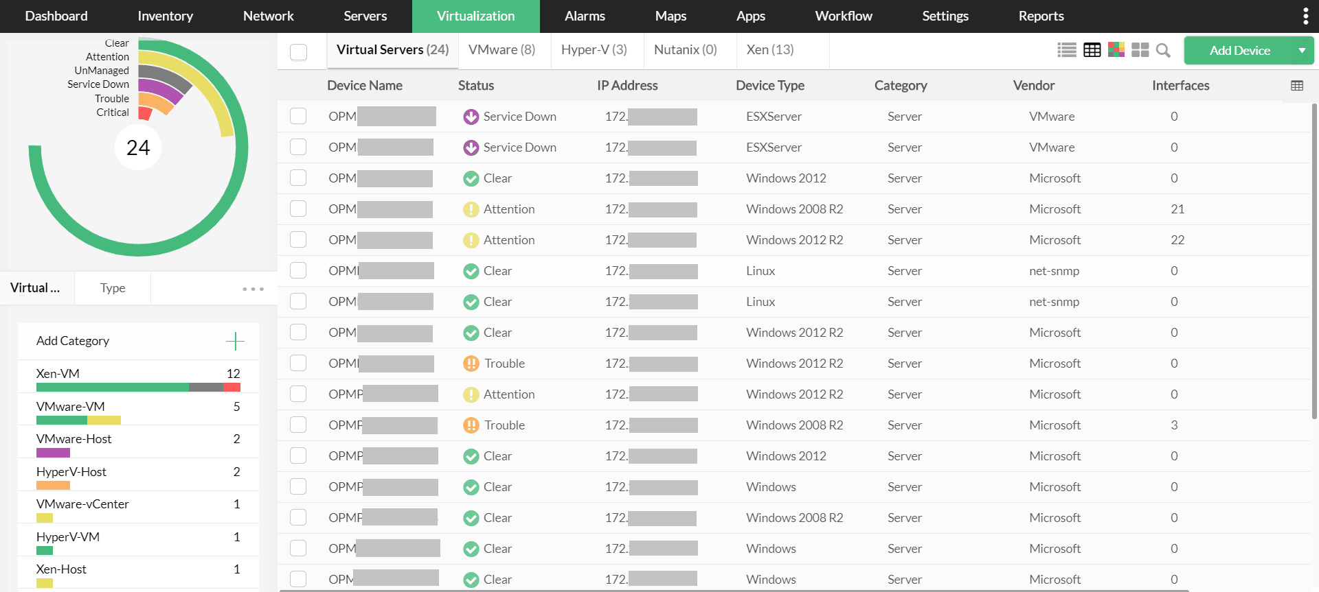 ・仮想環境:大規模ネットワークでは、多様なニーズに対応するため、最先端のネットワーク技術が採用されていることもあります。それらを監視するために複数のツールを使用することは、非効率的で費用対効果に優れた方法ではありません。OpManagerを使用すれば、スイッチやサーバーなどの機器だけでなく、VMware、Hyper-V、XenServers、Cisco UCS、Nutanixなどのインフラも統合コンソールで監視できます。さらに、Cisco IP SLAを使用してWANを監視することもできます。