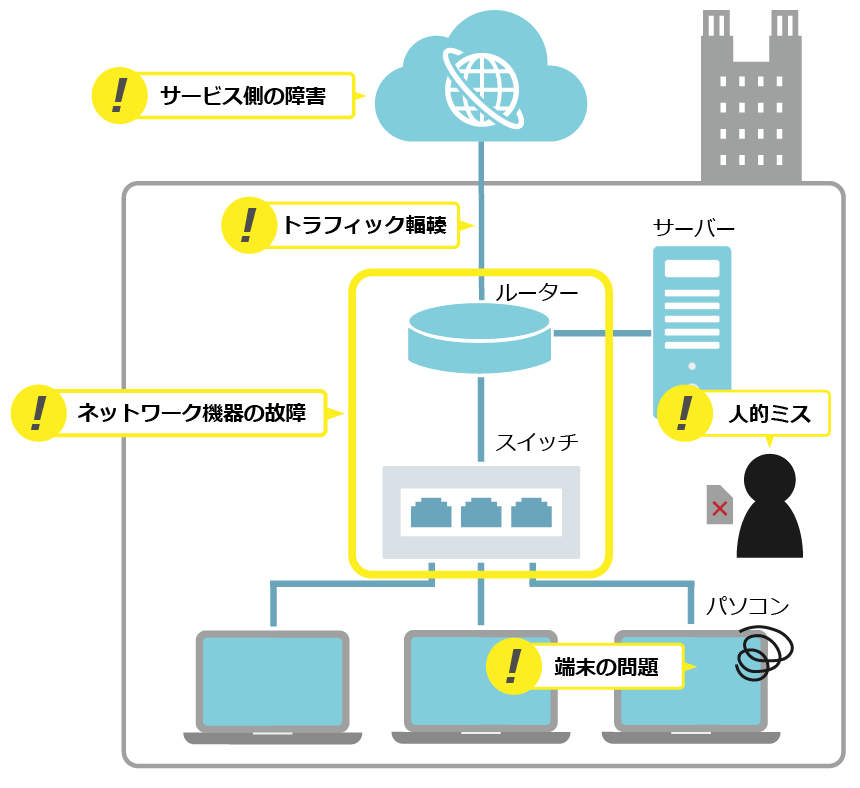 ネットワーク機器の設定ミスやケーブル配線の間違えなど、ネットワーク機器の設定や配線を1つ間違うだけで、配下に接続された端末は意図通りにネットワーク接続できなくなってしまう可能性があります。