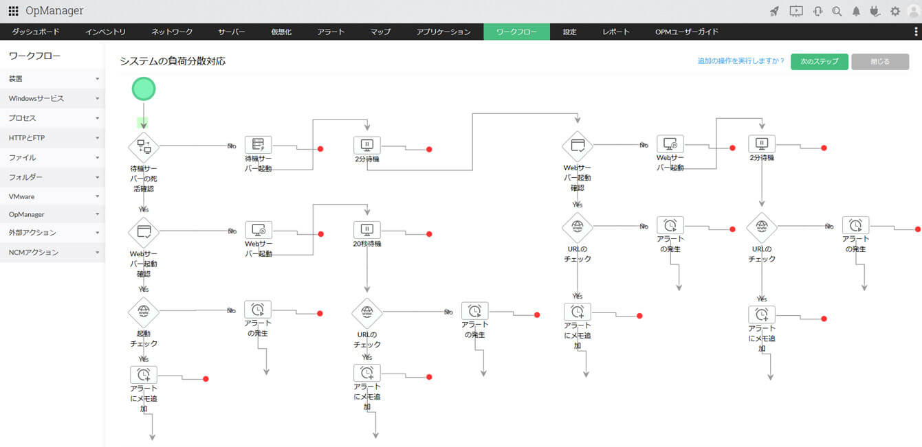ITワークフローの自動化により、定型業務やトラブルシューティングの一次対応を自動化可能です。OpManagerのワークフローはプログラミングの知識を必要とせずソフトウェア上でドラッグ&ドロップで作成できます。