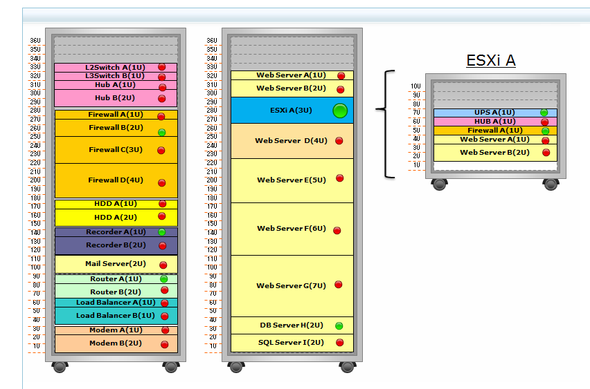 ビジネスビューをカスタマイズし、仮想化環境と物理環境を同じ画面で監視できます。上図は、左が物理サーバーのラック、右の小さなラックは、仮想サーバーです。円いアイコンは各サーバー/ネットワーク機器のステータスを色で表現しています。サーバーがダウンしているとアイコンが赤くなり、視覚的にサーバーの状態を確認することができます。
