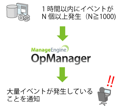 [大量に発生しているイベントの処理]同一デバイスから同じイベントが継続して大量に発生している場合に、イベント通知を抑止し、その事象を知らせるアラートを生成することによって、OpManagerの使用リソースを削減し、さらに問題が継続的に起きていることをわかりやすく担当者に通知します。