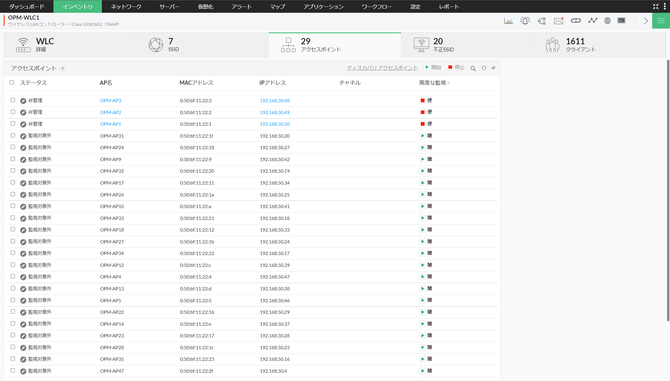 WLCが管理しているアクセスポイントのリストが表示されます。 また、各装置の可用性やリソース使用率などを個別に監視することも可能です(個別のアクセスポイントの監視については「高度な監視」としてオプション機能となります)。