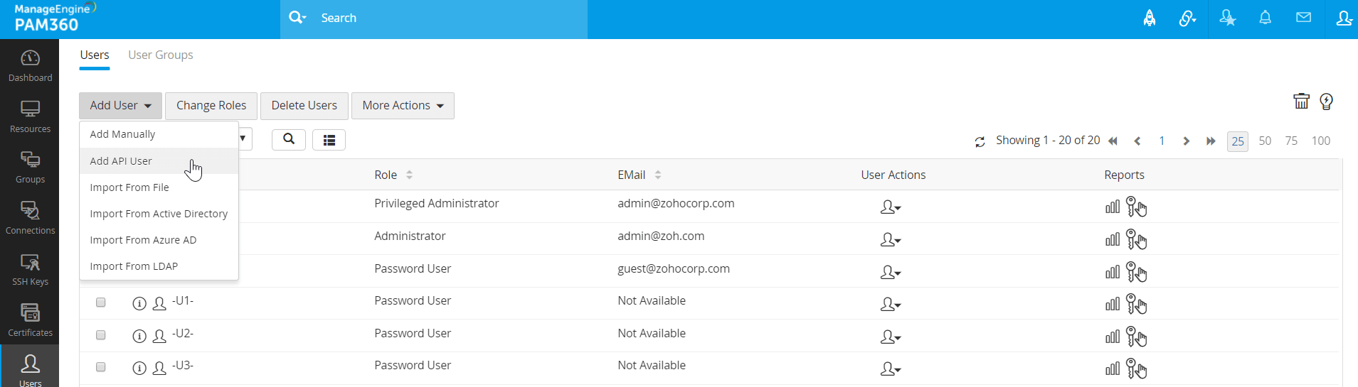 PAM360では、APIユーザーを手動で追加できます。API ユーザーアカウントは、アプリケーション間のパスワード管理用にパスワード管理 API を構成するために必要です。パスワード管理APIの使用者向けにAPIユーザーアカウントをPAM360で作成する必要がありま、そこで各APIユーザーアカウントをシングルエンドポイントに貼付する必要があります(一般的には、ユーザーアカウントが一意に識別されるようにAPIを使用するサーバーまたはデスクトップ-例えば、user@hostname)。