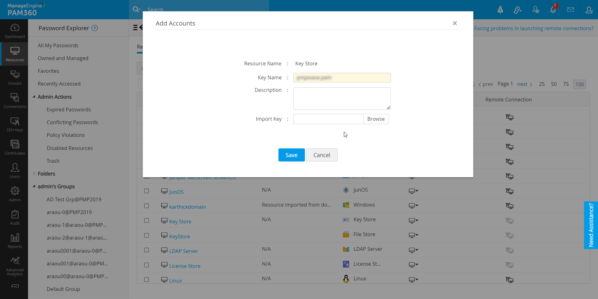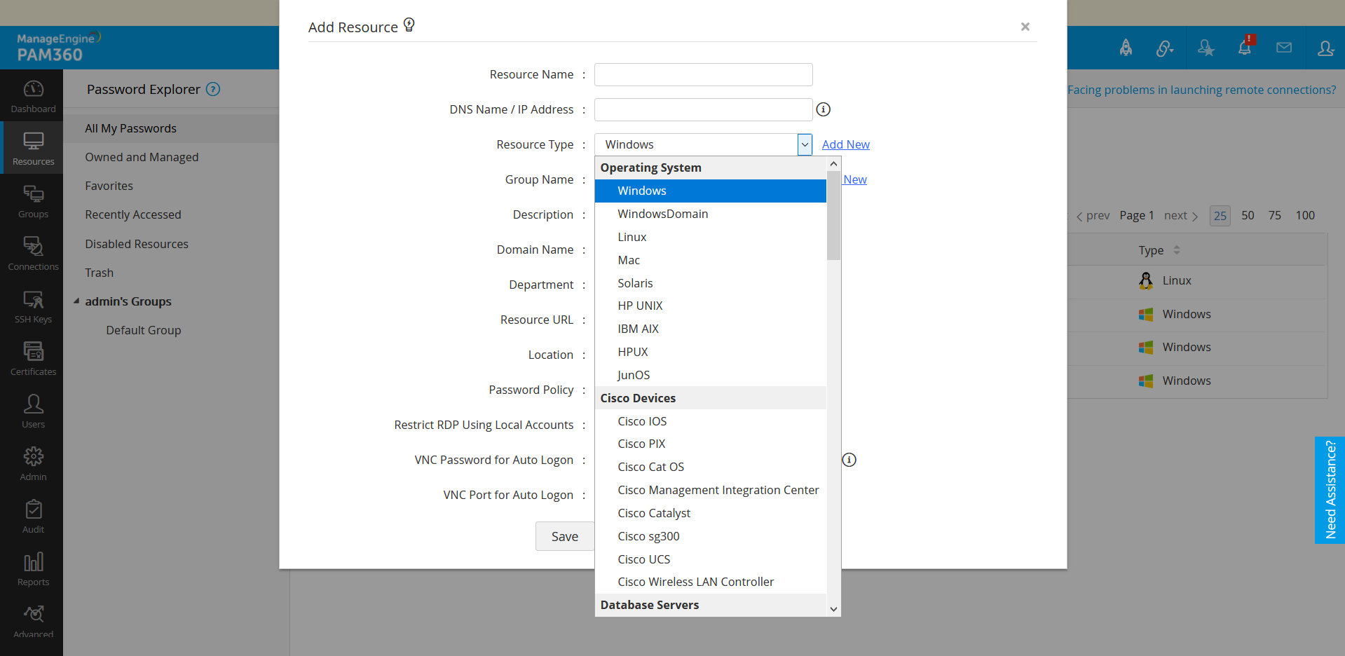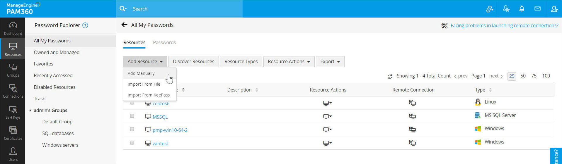 特権アカウントのパスワードを管理するには、エンドポイントをリソースとしてPAM360に追加する必要があります。リソースという用語は、ユーザーアカウントとパスワードを保持するサーバー、アプリケーション、ネットワークデバイス、またはアプライアンスを指します。リソースをPAM360に追加するには異なるつの方法があります。すなわち:リソースの手動の追加、リソースのファイルからのインポートおよびリソースの検出。