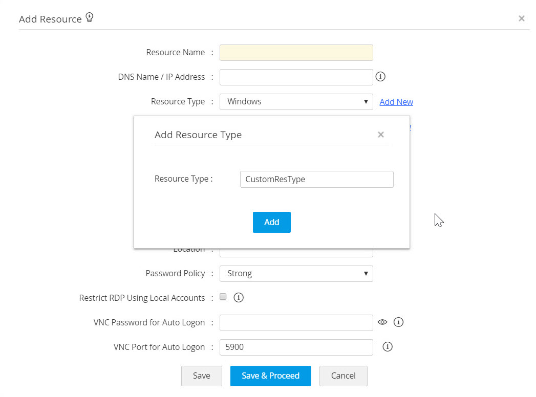 - [リソースタイプ]をドロップダウンから選択します(デフォルト値はWindowsです)。リソースタイプにあわせて、PAM360は一意の手順でパスワードをリセットします。たとえば、Windows のパスワードリセットメカニズムは、Linux や Mac のパスワードリセットメカニズムと同じではありません。このフィールドは、リソースを種類に基づいて整理するのにも役立ちます。カスタムリソースタイプを追加するには、このフィールド横の[新規追加]オプションをクリックします。アプリやプリンター等のカスタムリソースタイプをポップアップウインドウに入力し、[追加]をクリックして、カスタムリソースをリソースタイプドロップダウンから選択します。PAM360がサポートするリソースのタイプおよびその管理方法についての詳細は、ここをクリックしてください。