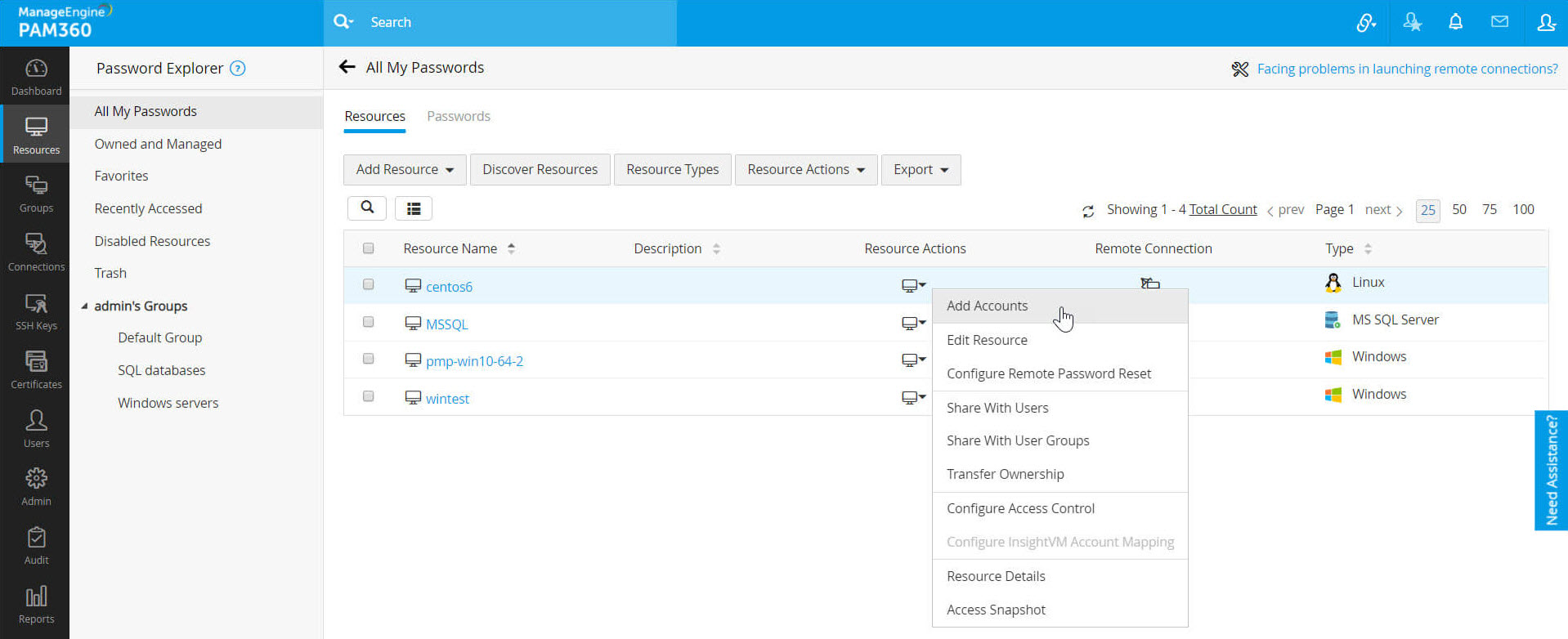 リソースをPAM360に追加したら、下の手順にしたがって、ユーザーアカウントとパスワードを新しいリソースに追加します。ユーザーアカウントをリソースに追加できる方法は2つあります: