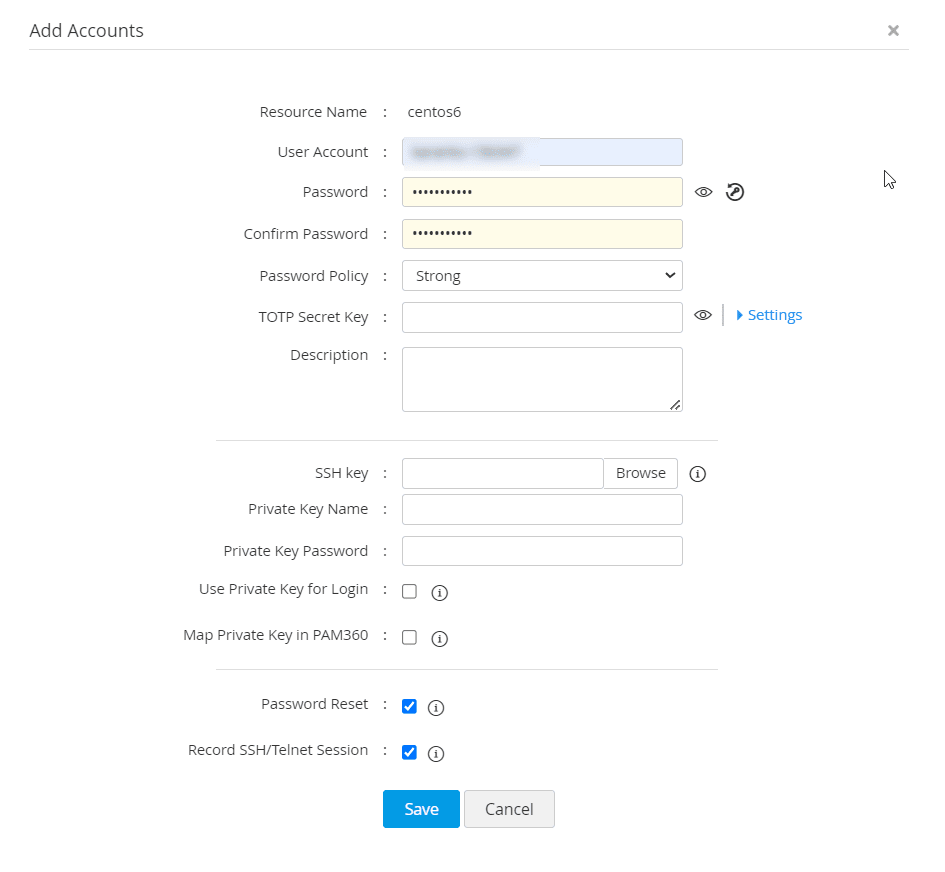 - アカウント別の詳細事項をメモフィールドに入力することをお勧めします。このフィールドは、PAM360の検索ツールを使って、特定アカウントを検索するときにも検索されるためです。