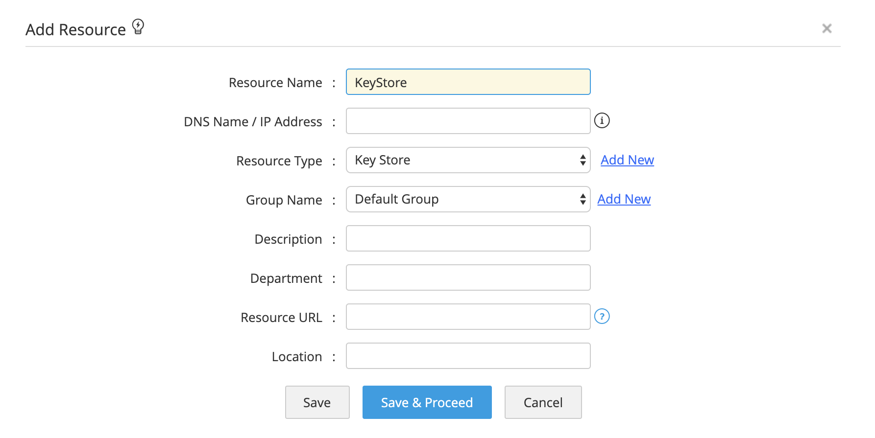- カスタムリソースタイプを追加するには、このフィールド横の[新規追加]オプションをクリックします。ポップアップウィンドウにカスタムリソースタイプ(KeyStore等) を入力し、[追加]をクリックして、[リソースの種類]ドロップダウンからカスタムリソースを選択します。