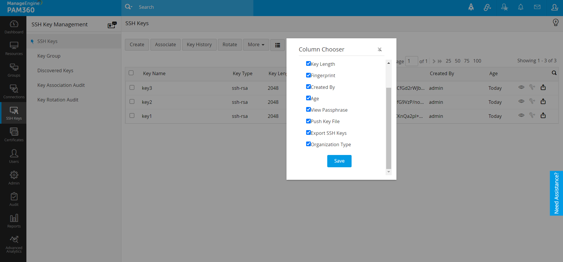) を使用して列を整理し、要件に応じてデフォルト フィールドと追加フィールドの両方を表示または非表示にすることを選択します。列選択アイコンは、次のタブの列を整理するのに役立ちます: SSH キー、証明書、レポート、ダッシュボード。