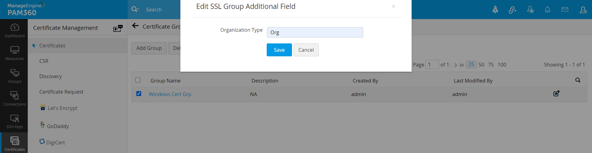 - 証明書グループの追加フィールドを編集するには、[証明書]>>[証明書グループ]に移動します。必要なグループを選択し、[追加フィールドの編集]をクリックします。