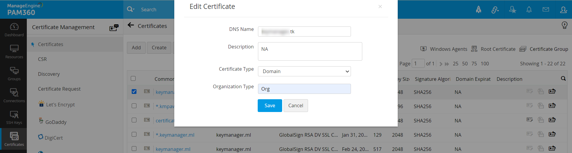 - [証明書の編集]ウィンドウで値を編集し、[保存]をクリックします。この値は、選択した証明書に対してのみ更新されます。