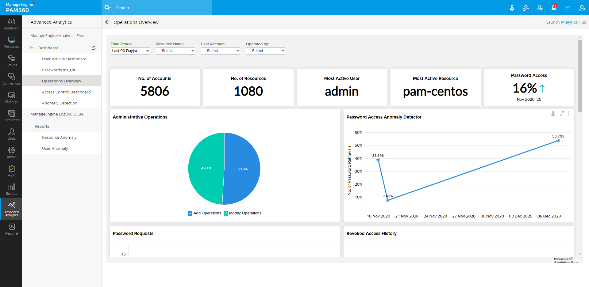 操作概要ダッシュボードには、選択した時間長内で実行されたリソースとパスワードに関連した操作の概要が記載されます。[リソース名、アカウント名]、および[時間長]フィルターを使って、ダッシュボードビューを再調整します。存在するリソースとアカウントの数、もっともアクティブなユーザー、もっともアクティブなリソース、およびパスワードアクセス割合等の詳細が一覧で表示されます。他のダッシュボードと同様、Analytics Plusは、作動詳細を各種セクションに分離し、解釈しやすいようにグラフ表示します。スクロールダウンして、利用可能なグラフをすべて表示します。
