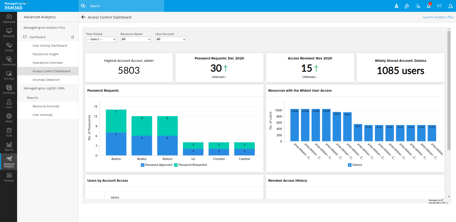 アクセスコントロールダッシュボードには、選択した時間長内で実行されたリソースとパスワードに関連した操作の概要が記載されます。[リソース名、アカウント名]、および[時間長]フィルターを使って、ダッシュボードビューを再調整します。ほとんどの数のアカウントにアクセスしたユーザー、広く共有されているアカウント名、およびパスワード要求の合計数、並びに選択した時間長に取り消された要求数等、詳細が一覧で表示されます。他のダッシュボードと同様、Analytics Plusはアクセスコントロールの詳細を各種セクションに分離し、解釈しやすいようにグラフ表示します。スクロールダウンして、利用可能なグラフをすべて表示します。