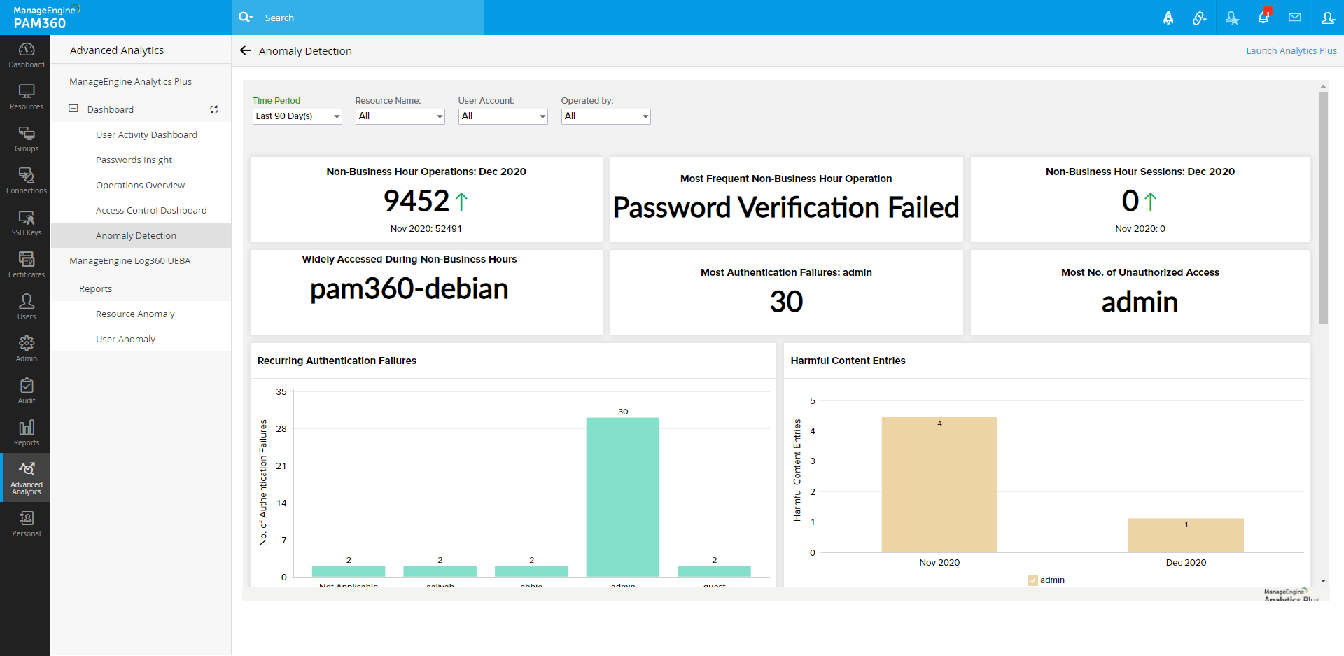 - このページには、PAM360と両方の製品を統合した場合、ManageEngine Analytics PlusとManageEngine Log360 UEBAの両方のダッシュボードが表示されます。データは、Analytics PlusとLog360 UEBAサーバーのそれぞれに表示されるのと同じ形で、ここで分離されます。