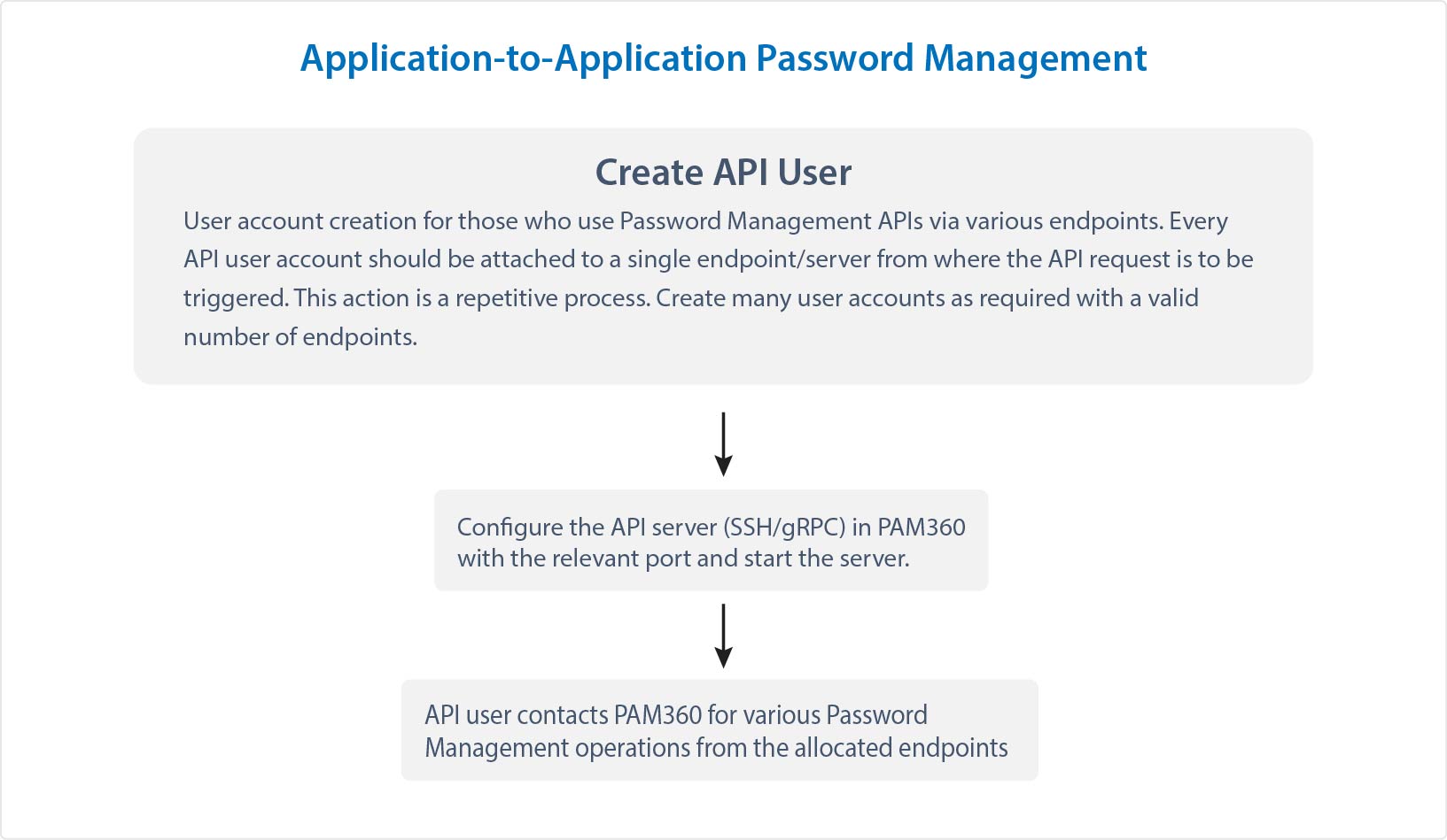 次の図は、PAM360のAPI管理に含まれる手順の概要を示しています: