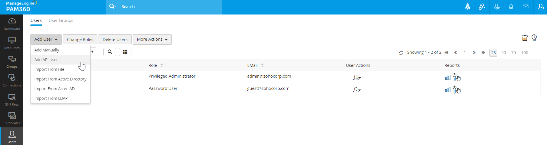 - PAM360 APIのみを使用するユーザー アカウントは、PAM360で作成する必要があります。すべての API ユーザーアカウントは単一のエンドポイント (API が使用されるサーバーまたはデスクトップ) に接続する必要があります。そのため、ユーザーアカウントは user@hostname として一意に識別されます。