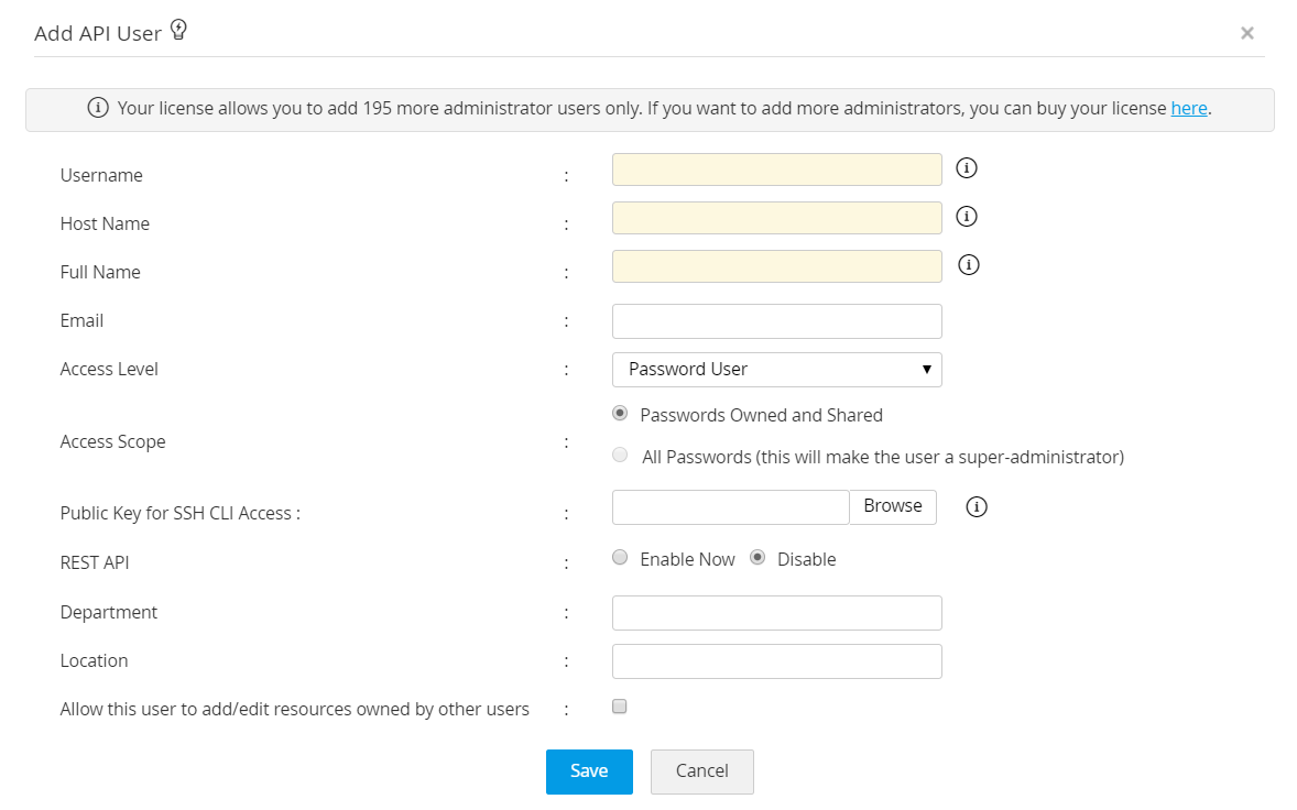 上で説明したように、APIユーザーは、機能するように構成されているホストからのみ、パスワードの取り込みやその他の操作のためにPAM360にアクセスできます。つまり、ユーザーの作成時に、APIユーザーがパスワード管理操作のためにPAM360にアクセスするホストの名前を入力することになります。APIユーザーは、指定されたホストからのみPAM360にアクセスできます。