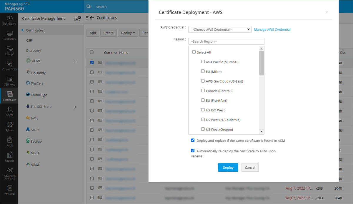 PAM360のAWS-ACMとの統合により、証明書をAWS-ACMに展開し、そのコンソールから管理することができます。証明書をAWS-ACMに展開するには、下の手順に従います: