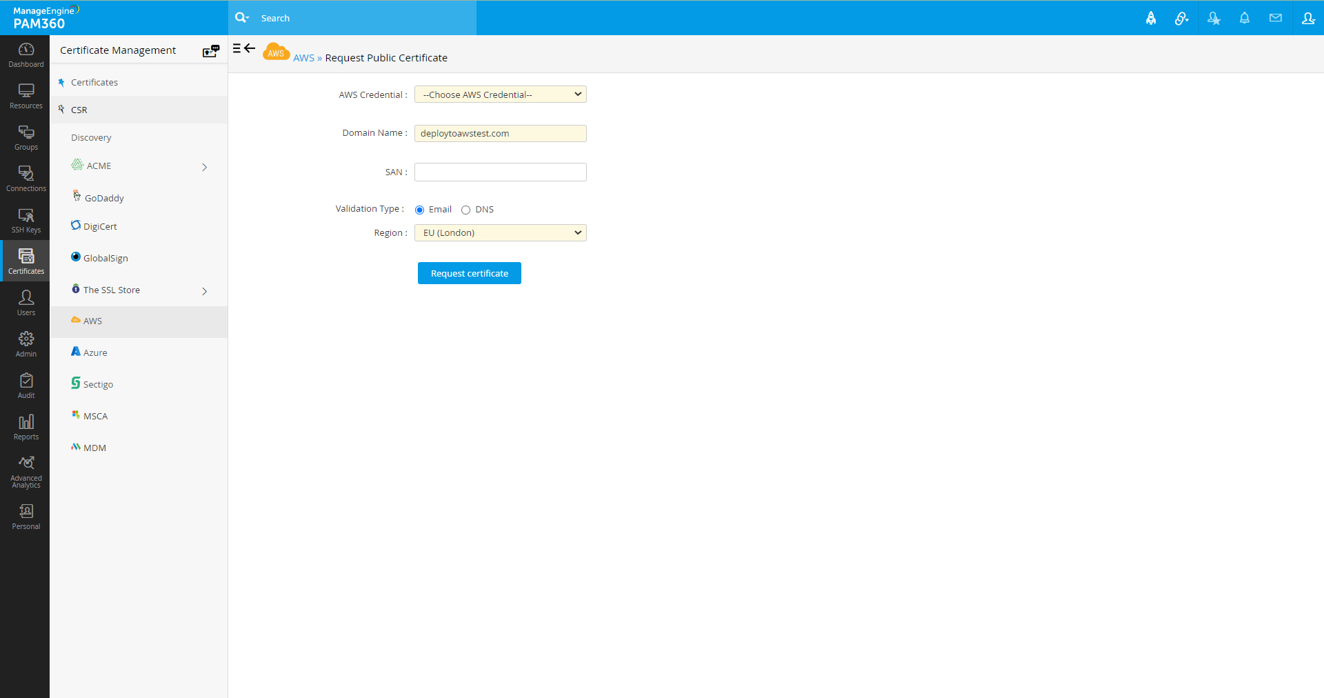 PAM360では、新しい証明書を作成し、製品中で管理できます。AWS-ACMは、新しい証明書の作成をサポートしていません。ただし、証明書をPAM360からAWS-ACMに作成、要求およびインポートでき、AWS 管理コンソールから管理できます。証明書のAWS-ACMへのインポートについての詳細は、ここをクリックしてください。