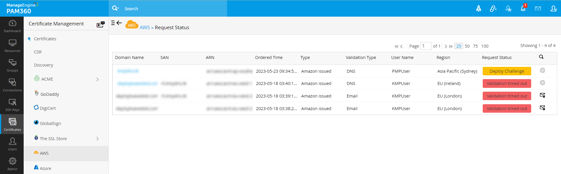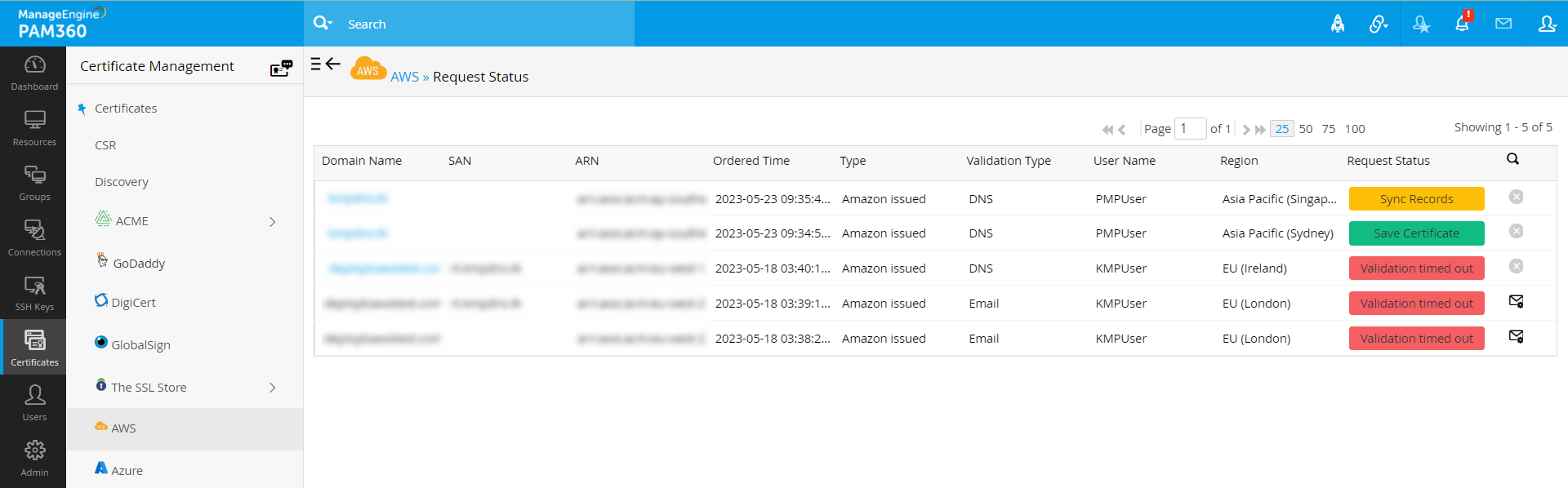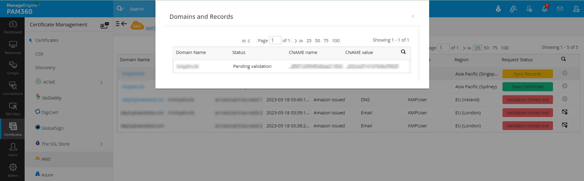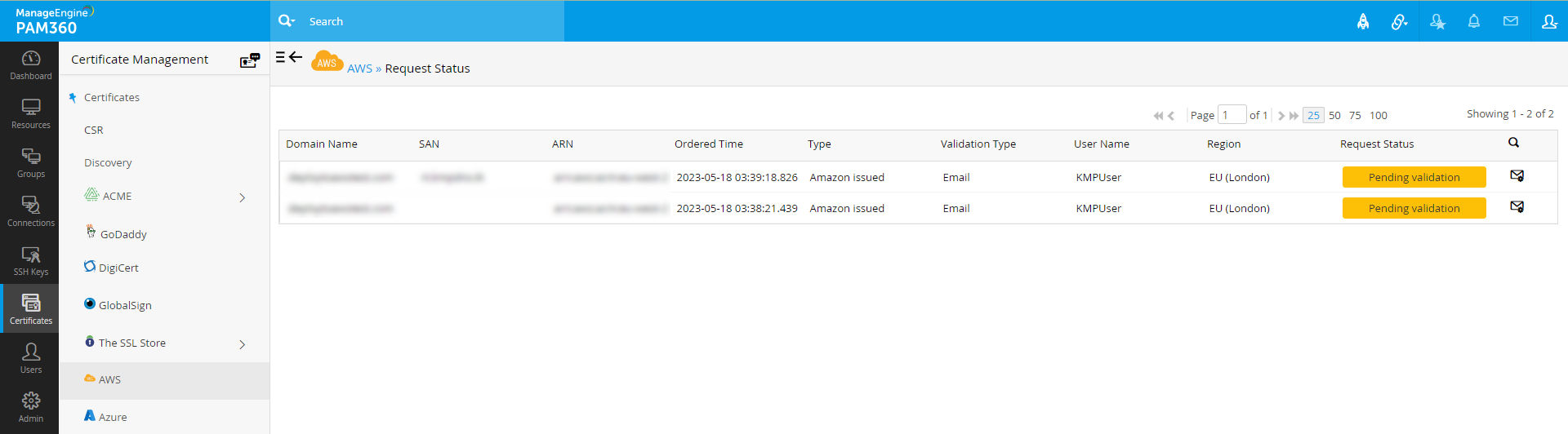 PAM360では、AWS-ACMからパブリックとプライベート証明書の両方を要求でき、PAM360インターフェイスから管理できます。