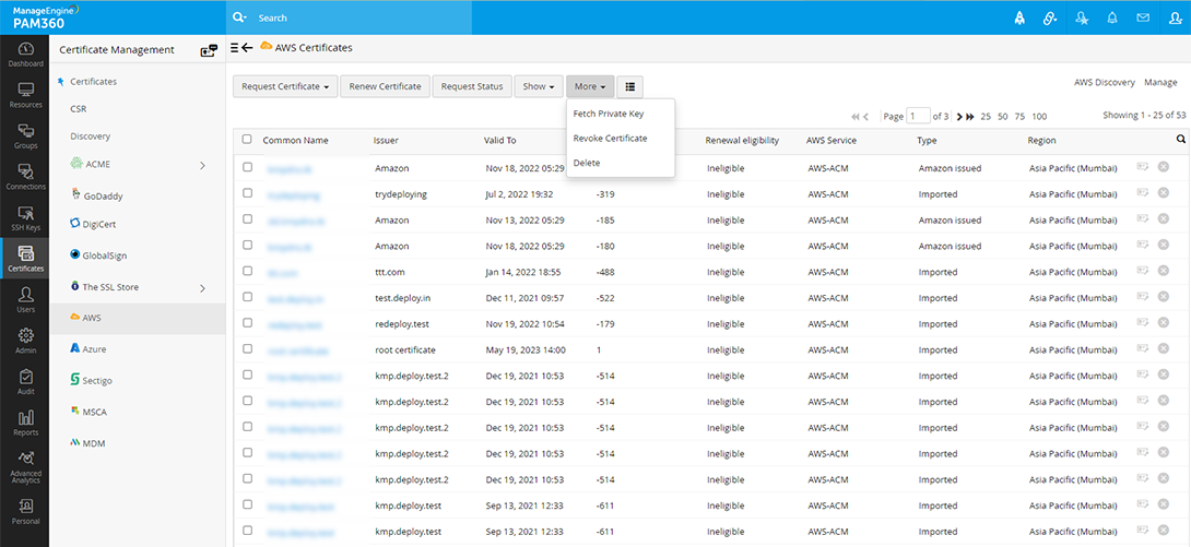 削除オプションを使うと、証明書がPAM360インターフェイスから削除され、本製品から管理することが出来なくなりますので、注意してください。ただし、AWS-ACMから証明書は削除されません - 証明書はまだAWSコンソールから表示および管理できます。