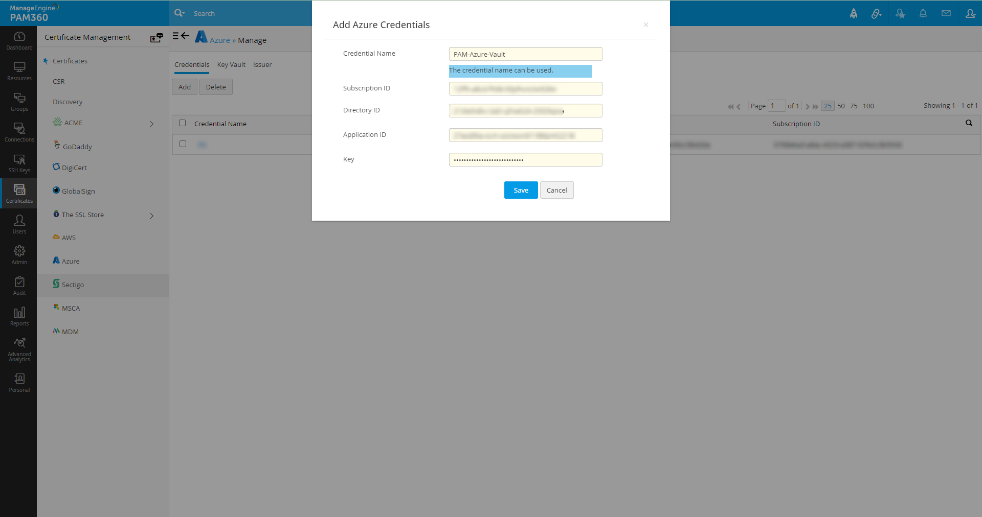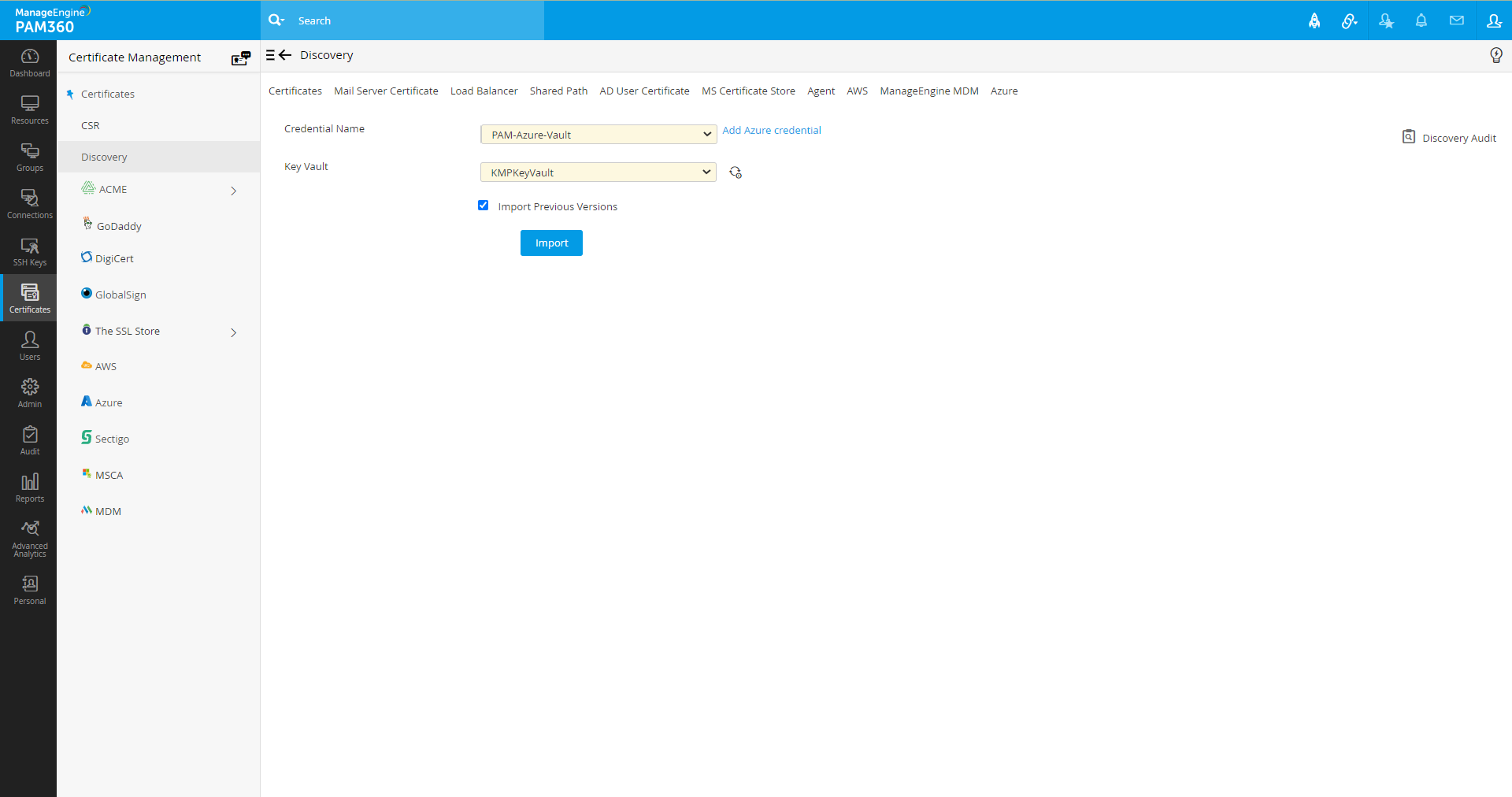 Key Vaultおよびその対応証明書をAzureポータルからインポートを開始するには、Azure認証情報をPAM360インターフェイスに追加する必要があります。